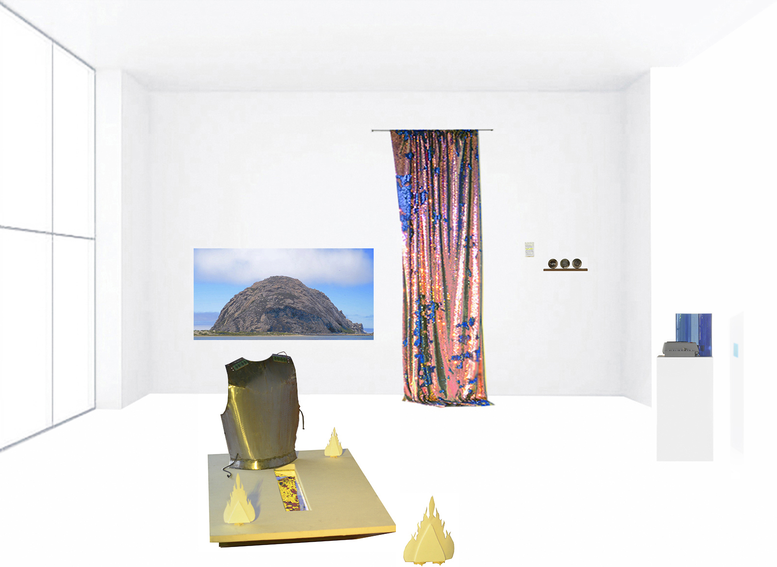 On Such a Winter Day (For Night) welcomes the visitor to decode, on a duration of time that she decides, a set of new data - collected during a summertime spent in San Francisco, Morro Bay, and Los Angeles – in a room with a sea view. This set is proposed as an echo scene, in the same way we can talk of an echo chamber, bringing into resonance diverse traces and signs sampled during a recent residency on the American west coast. Here, Silicon Valley neo-gold rush, climate-change denial, nuclear “peaceful” projects for reshaping Earth, tectonic plates manifestations and social cataclysms, enter all at once the multitemporal stage and play opposite ghostly citizens with a few tragic lines from Shakespeare’s Coriolanus (1607). The set is also proposed as a mise-en-scène of its own displacement in its near future of replayed object of research through documentation in the framework of the research.