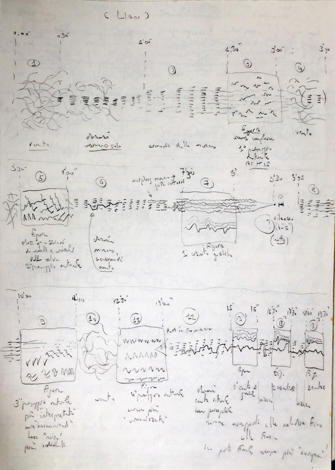 Over the years I kept thinking of the best approach when appropriating natural sounds and indigenous songs into my music. I felt it was important, especially with regard to the Sikuani music, to maintain the authenticity of the original recordings even as I was including them into my own sound world. The solution I found was to make explicit the appropriation process in the piece itself. In order to realise this, the music goes from an “objective” representation of the unedited recorded soundscapes to a progressively more recognizable compositional voice, where my own harmonic structures and melodic contours emerge from the original recordings. The piece thus follows an ideal parallel journey from “nature as it is” to “nature interpreted,” enacting the transition from the natural and human soundscapes of the Llanos to their artificial “European” recomposition. Discussing soundscape composition John Levak Drever advocates a parallel ethnographic approach, where “compositional processes and audio manipulations that previously lay transparent could be exposed and discussed within the work,” thus better reflecting the complexities of different cultures (Drever 2002: 24-25).