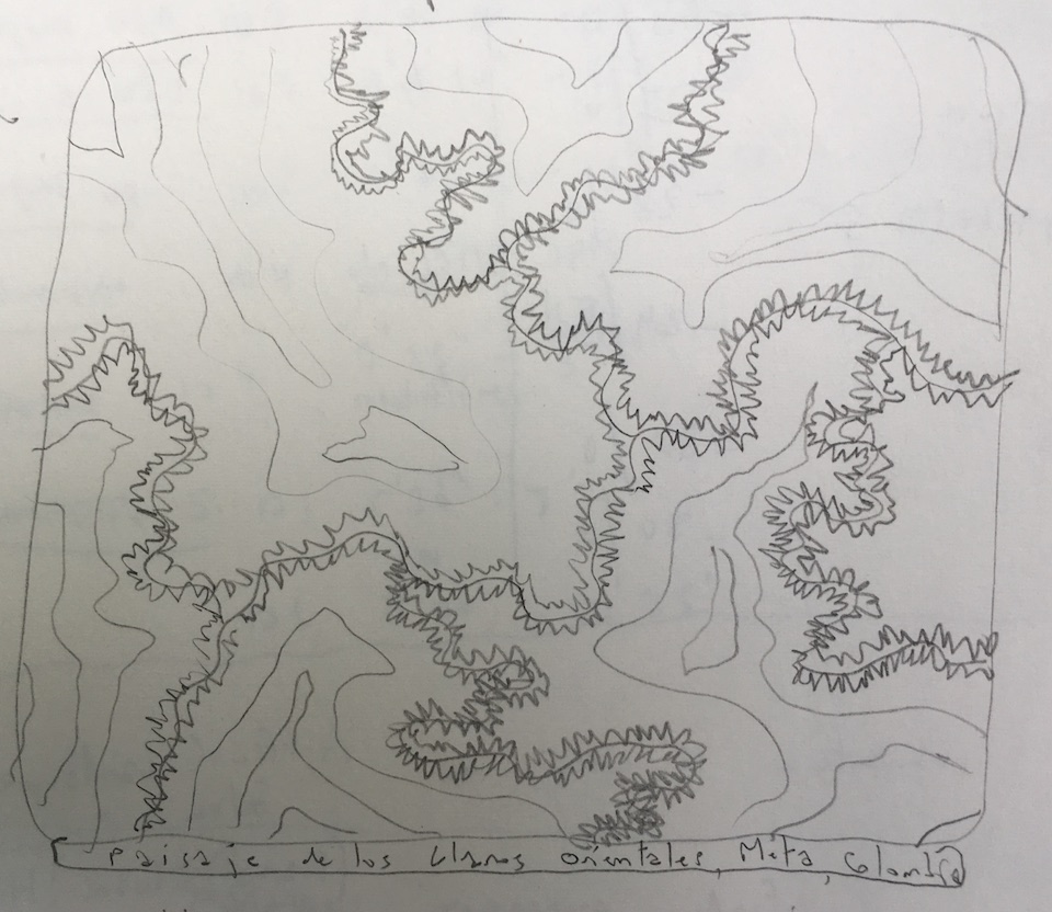 The idea was quite abstract at first, without any clear musical content. I was excited by the musical elements suggested by this landscape and by its fractal dimension, including the potential to exploit it musically, but in reality, I was still looking for a way to somehow “traverse” my drawing, to introduce a trajectory into the landscape. In other words, I was looking for a way to add time to a still image. The answer came after a trip to an indigenous settlement near Puerto Gaitán, deeper in the Llanos. This is where we met a group of Sikuani people (Hiwi, in their own language) and managed to make a number of recordings of their music, among them a ritual invocation for the spirits of the maloca (communal house) performed by the shaman of the group. The invocation starts thirty seconds after the beginning of the recording. At the end we hear the shaman complaining of not having slept enough: