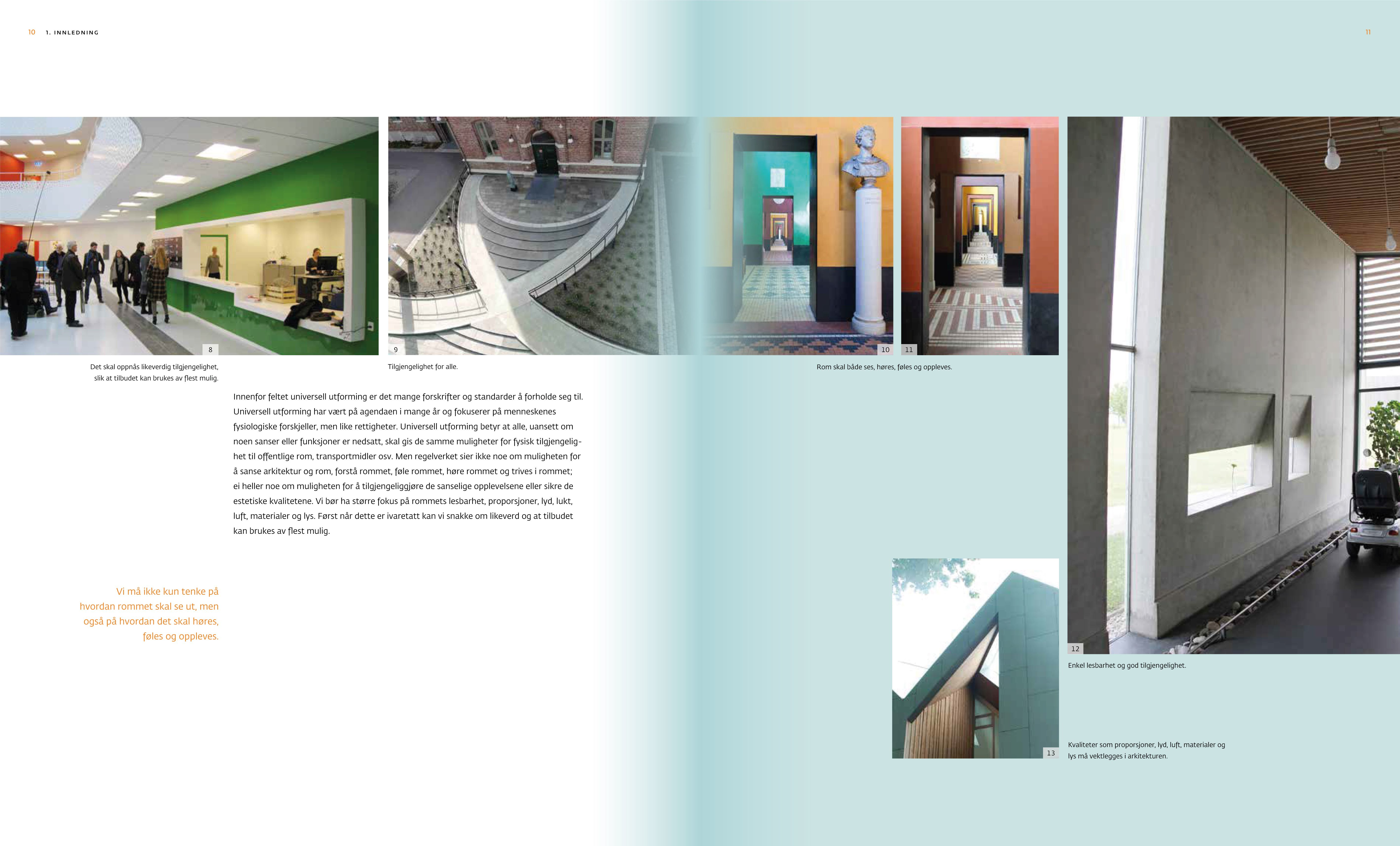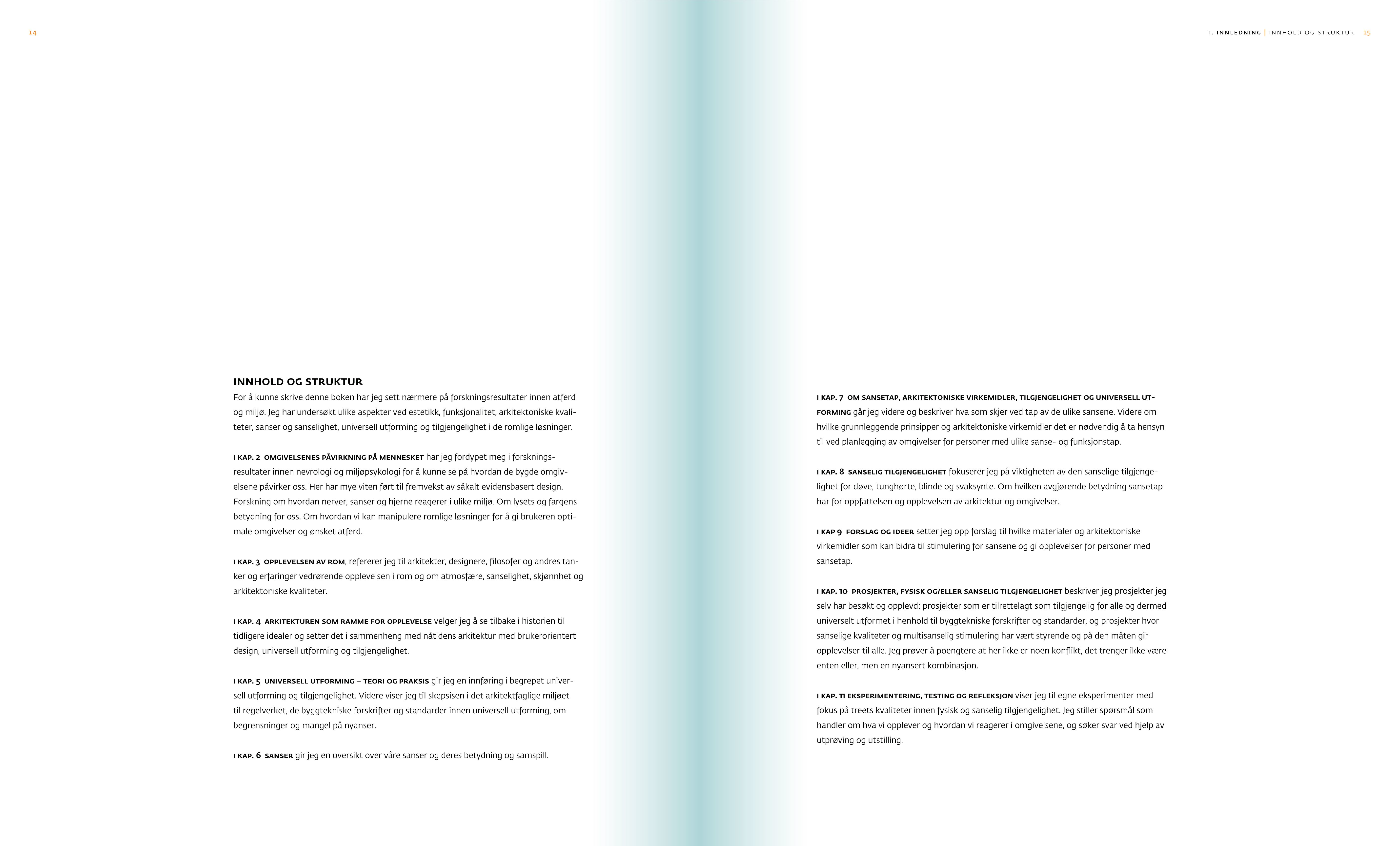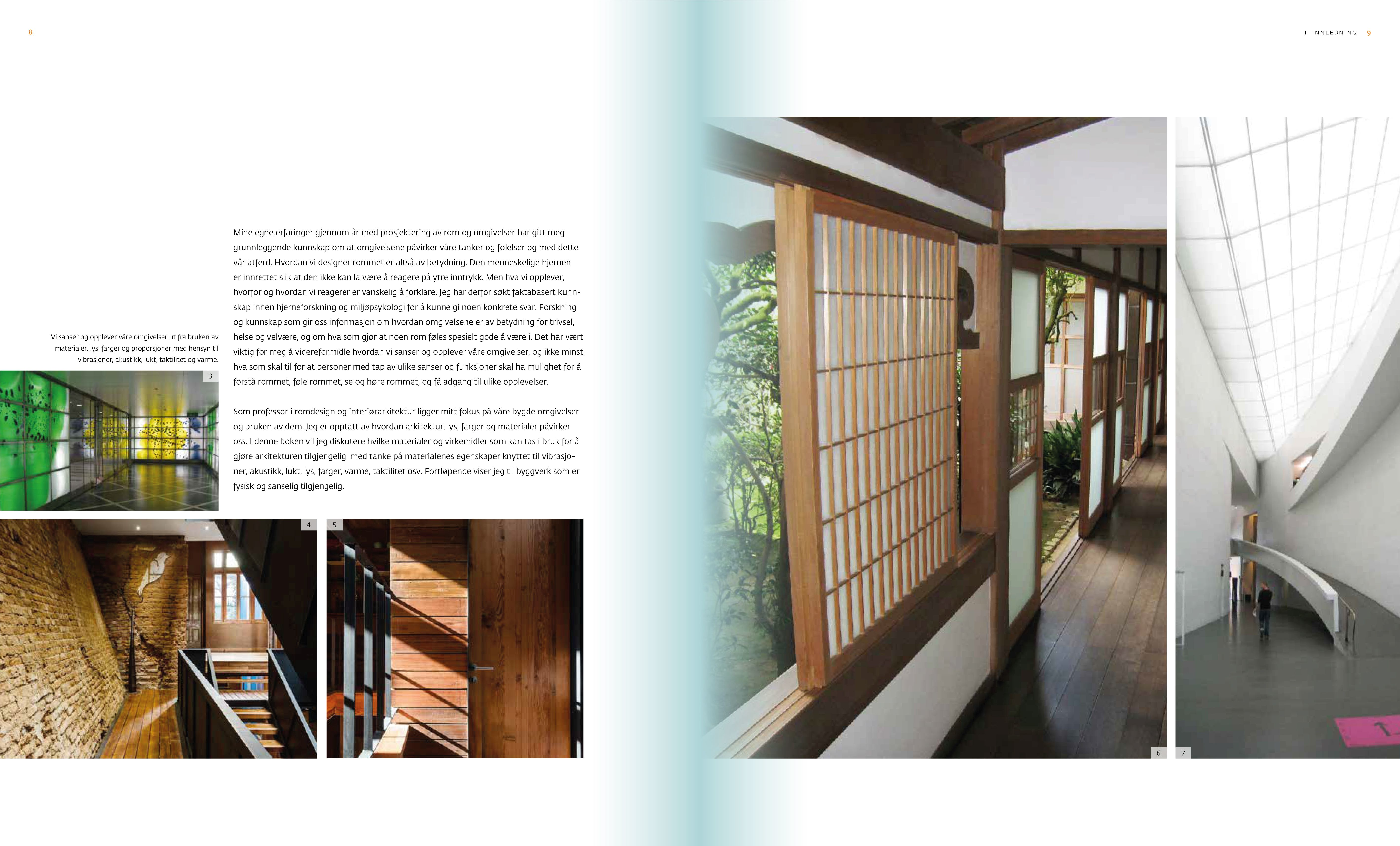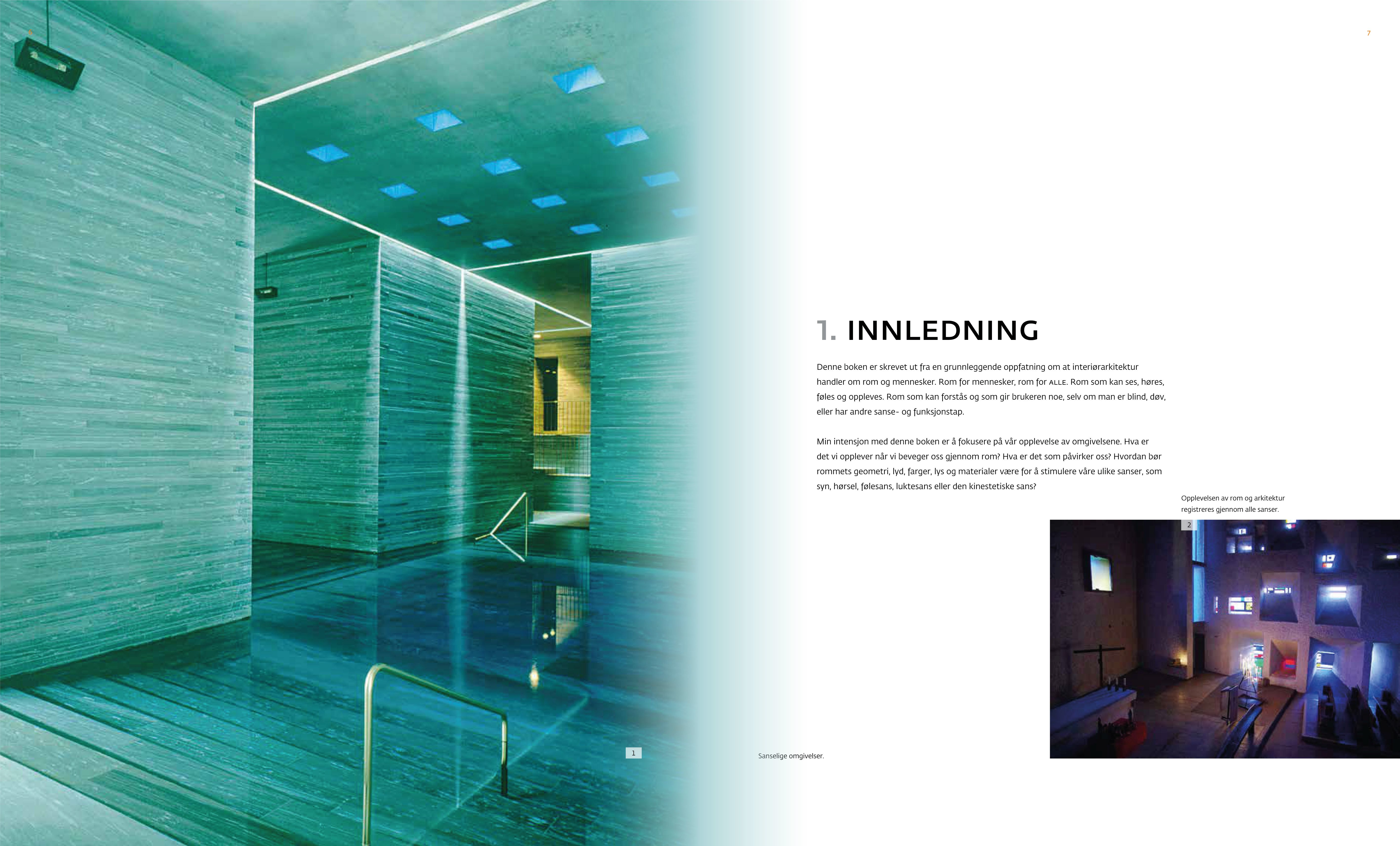 Omgivelsene påvirker våre tanker, følelser og med dette vår atferd. Hvordan vi designer rommet er altså av betydning. Den menneskelige hjernen er innrettet slik at den ikke kan la være å reagere på ytre inntrykk. Men hva vi opplever, hvorfor og hvordan vi reagerer er vanskelig å forklare. Jeg har derfor søkt faktabasert kunnskap innen hjerneforskning og miljøpsykologi for å kunne gi noen konkrete svar. Forskning og kunnskap som gir oss informasjon om hvordan omgivelsene er av betydning for trivsel, helse og velvære, og om hva som gjør at noen rom føles spesielt gode å være i. Det har vært viktig for meg å videreformidle hvordan vi sanser og opplever våre omgivelser, og ikke minst hva som skal til for at personer med tap av ulike sanser og funksjoner skal ha mulighet for å forstå rommet, føle rommet, se og høre rommet, og få adgang til ulike opplevelser.