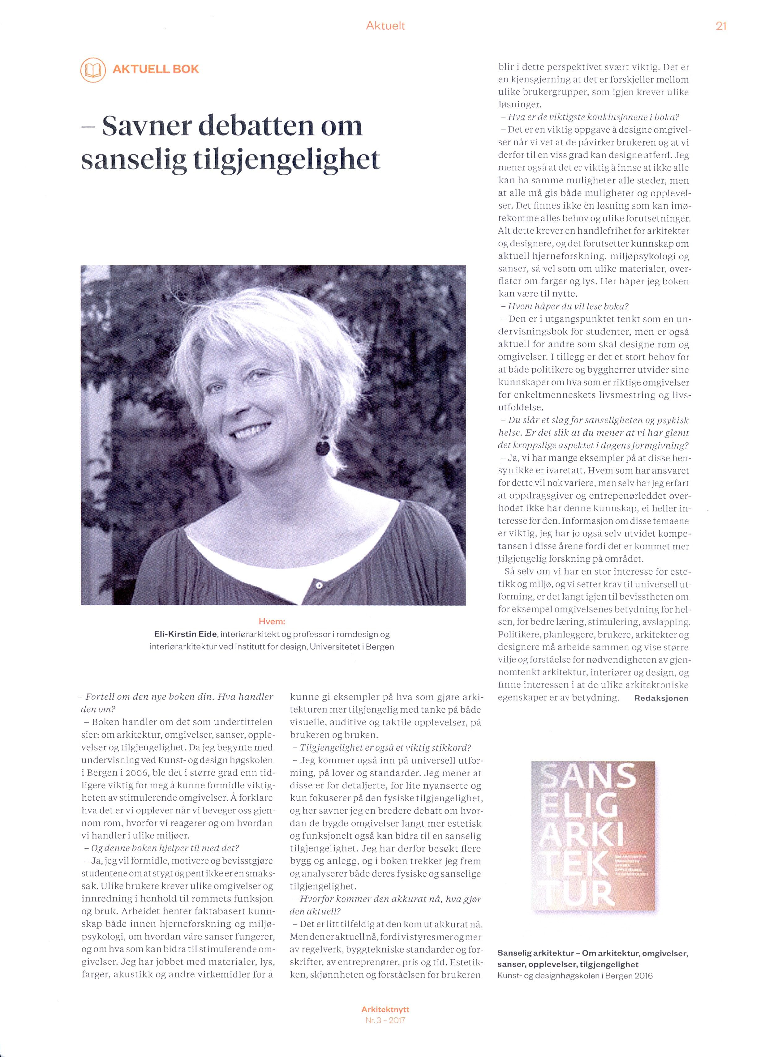 Boken «Sanselig Arkitektur» er skrevet ut fra en grunnleggende oppfatning om at interiørarkitektur handler om rom og mennesker. Rom for mennesker, rom for ALLE. Rom som kan ses, høres, føles og oppleves. Rom som kan forstås og som gir brukeren noe, selv om man er blind, døv, eller har andre sanse- og funksjonstap.
