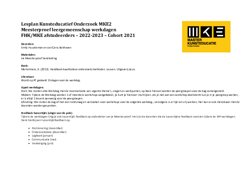 MKE is een leergemeenschap, dat betekent dat we ontwikkelen door spiegelen aan verschillende perspectieven. Aan de begeleidende docenten, aan gastdocenten, experts en elkaar.We rekenen erop dat je niet alleen kennis en vaardigheid komt halen, maar dat je ook komt brengen, daarom is actieve deelname en aanwezigheid essentieel. Door je onderzoek door je onderzoek in verschillende stadia te spiegelen aan de verschillende perspectievenkrijg je je doelen duidelijk voor ogen. Als je deelneemt aan de MP werkdagen, dan ga je een commitment voor alle MP werkdagen aan.
