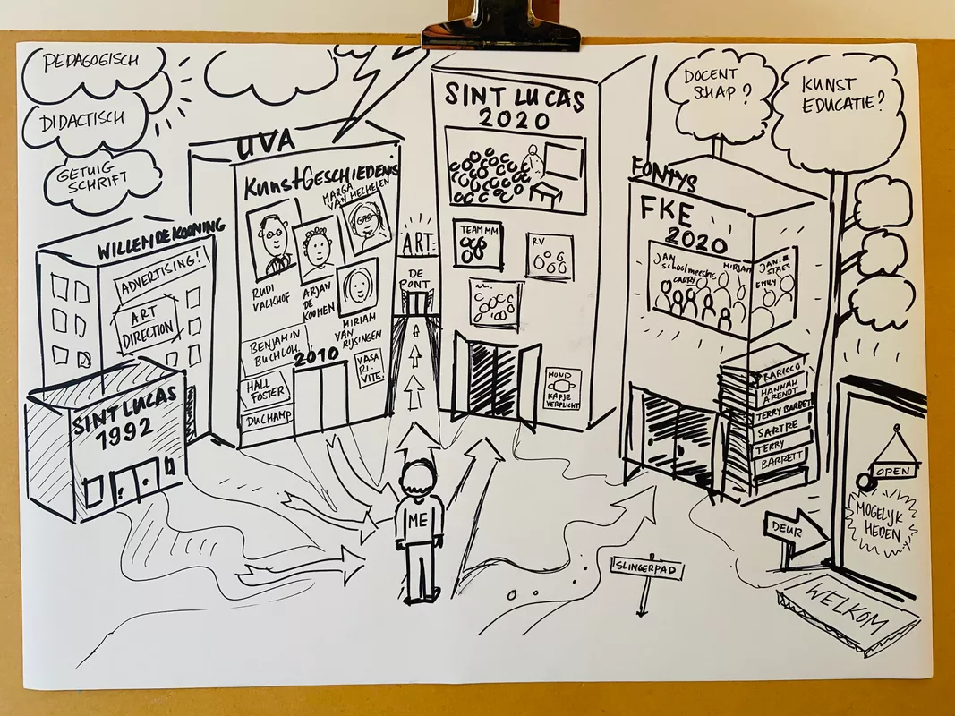 Maak: Visuele Kunsteducatieve positionering met jouw in relatie tot je velden en de bronnen (zie voorbeeld (let op: alleen bovenste gedeelte ingevuld) voel vrij om een eigen vorm te vinden dit mag digitaal of fysiek)