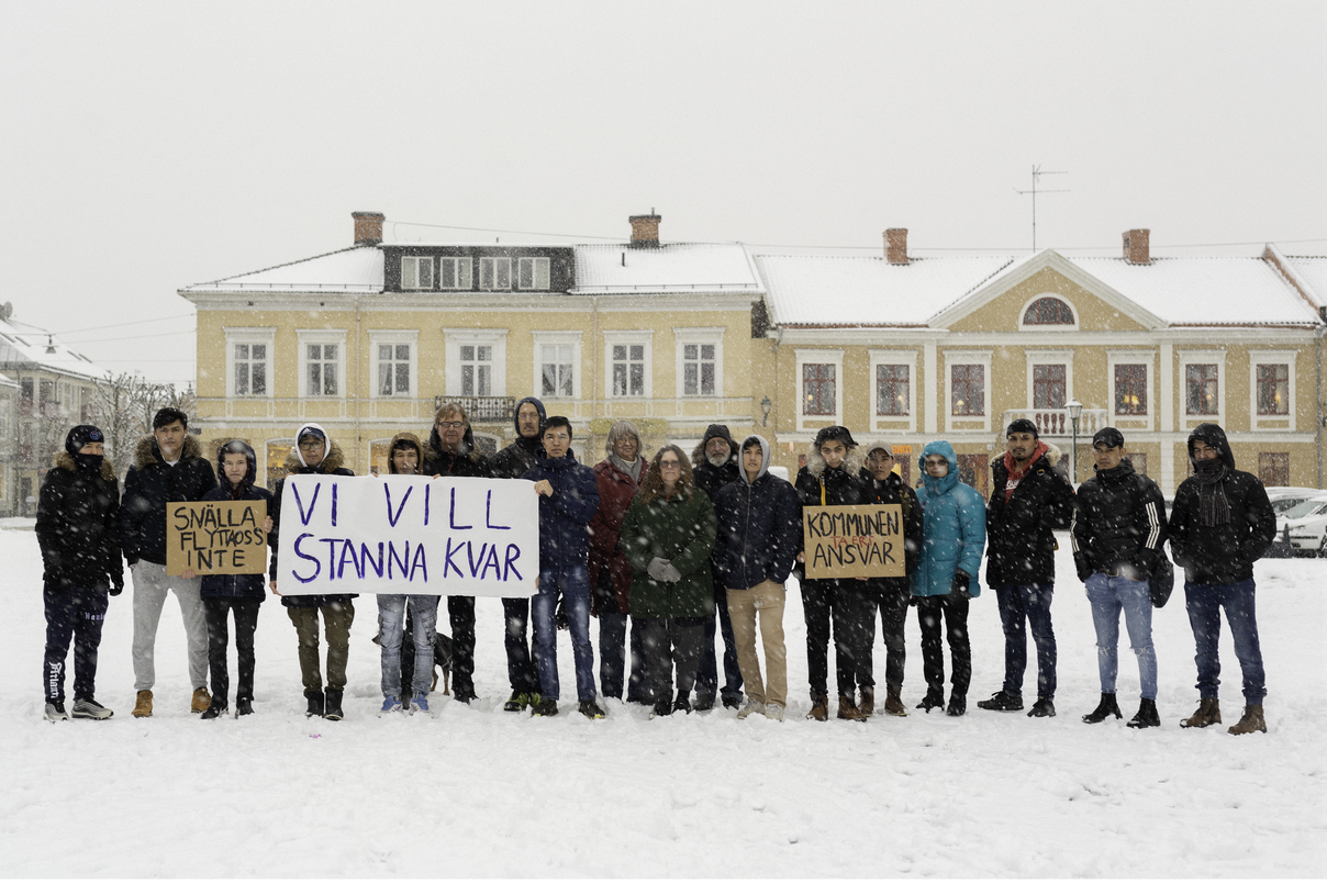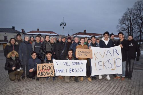 Det finns ett annat fotografi, från mars 2018. Fotografiet är taget på Stora torget, från nordväst, med kyrkan till vänster utanför bild. Det föreställer ett trettiotal människor. Några ungdomar i förgrunden håller i banderoller och plakat. Bakom dem står en lite större grupp äldre människor. Det är Föreningen Kvar i Eksjös första manifestation för de ensamkommande ungdomarnas rätt att stanna i Eksjö under hela sina asylprocesser. Ungdomarna har kommit till Eksjö av olika anledningar, men de är alla flyktingar från krig.