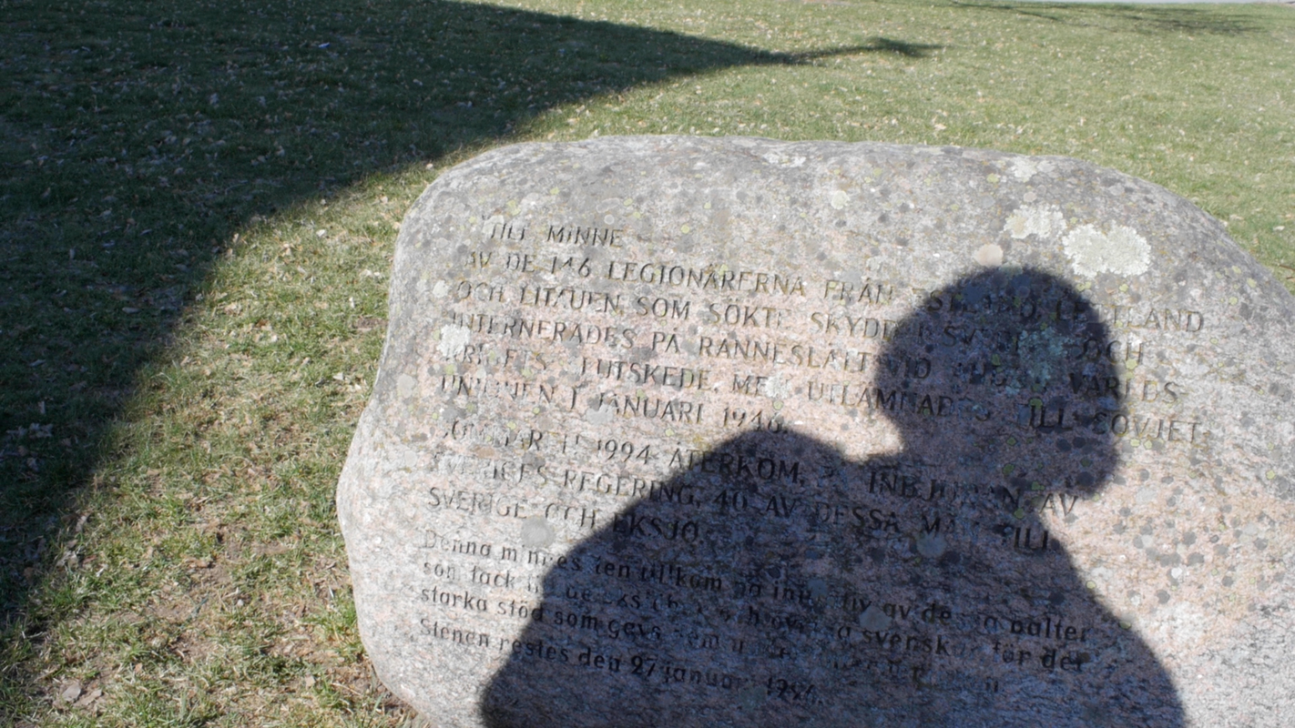 "Till minne av de 146 legionärerna från Estland, Lettland och Litauen som sökte skydd i Sverige och internerades på Ränneslätt vid andra världskrigets slutskede, men utlämnades till Sovjetunionen i januari 1946. Sommaren 1994 återkom, på inbjudan av Sveriges regering, 40 av dessa män till Sverige och Eksjö. Denna minnessten tillkom på initiativ av dessa balter som tack till de Eksjöbor och övriga svenskar för det starka stöd som gavs dem under interneringen."