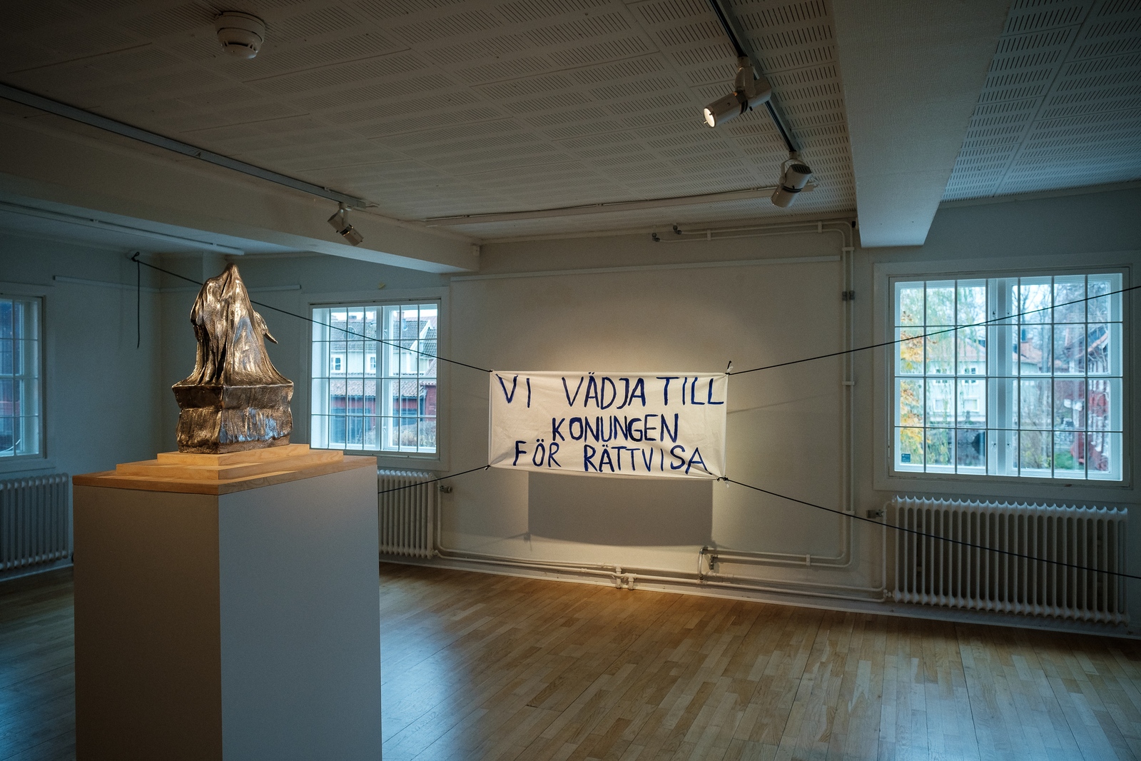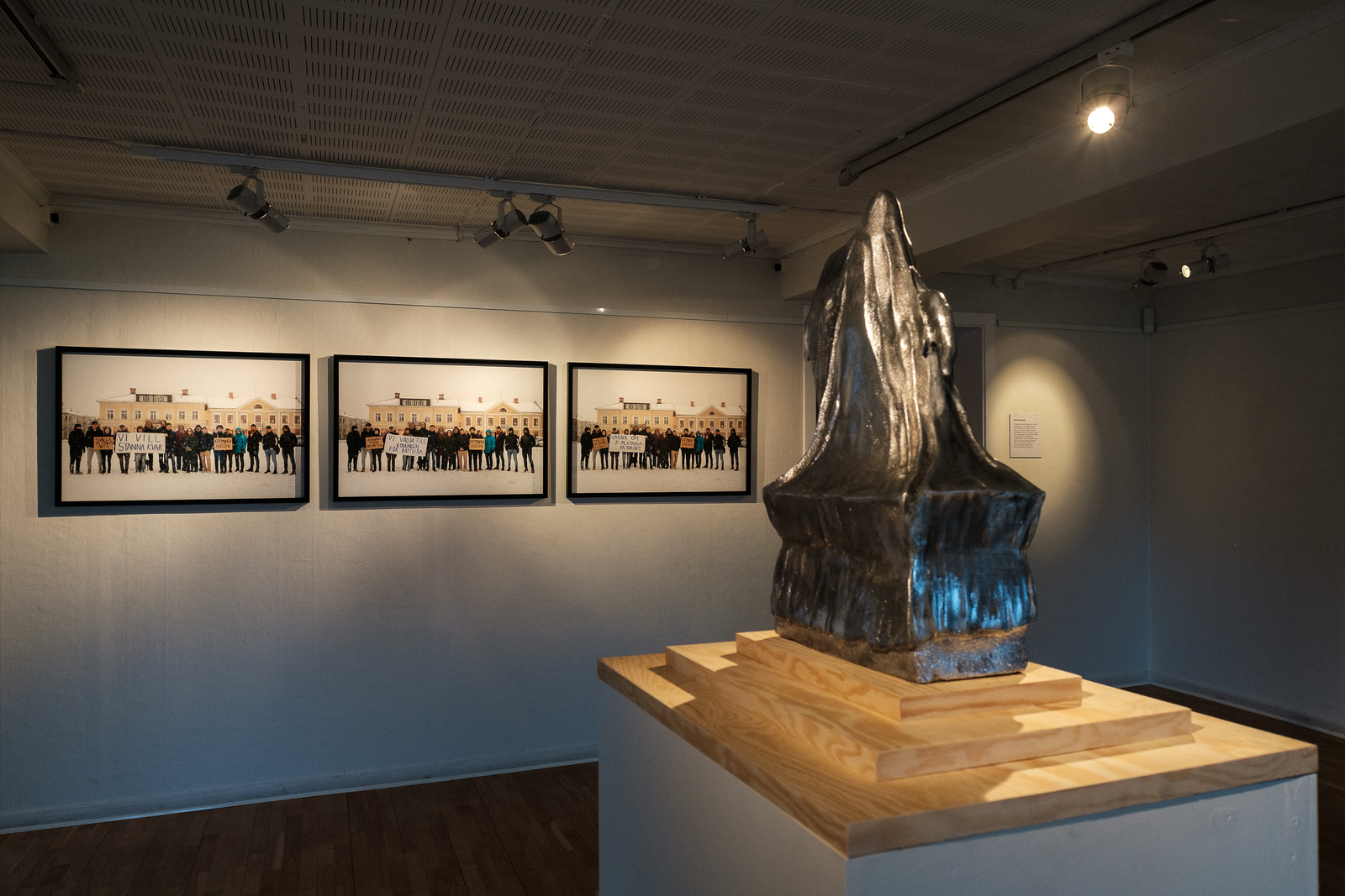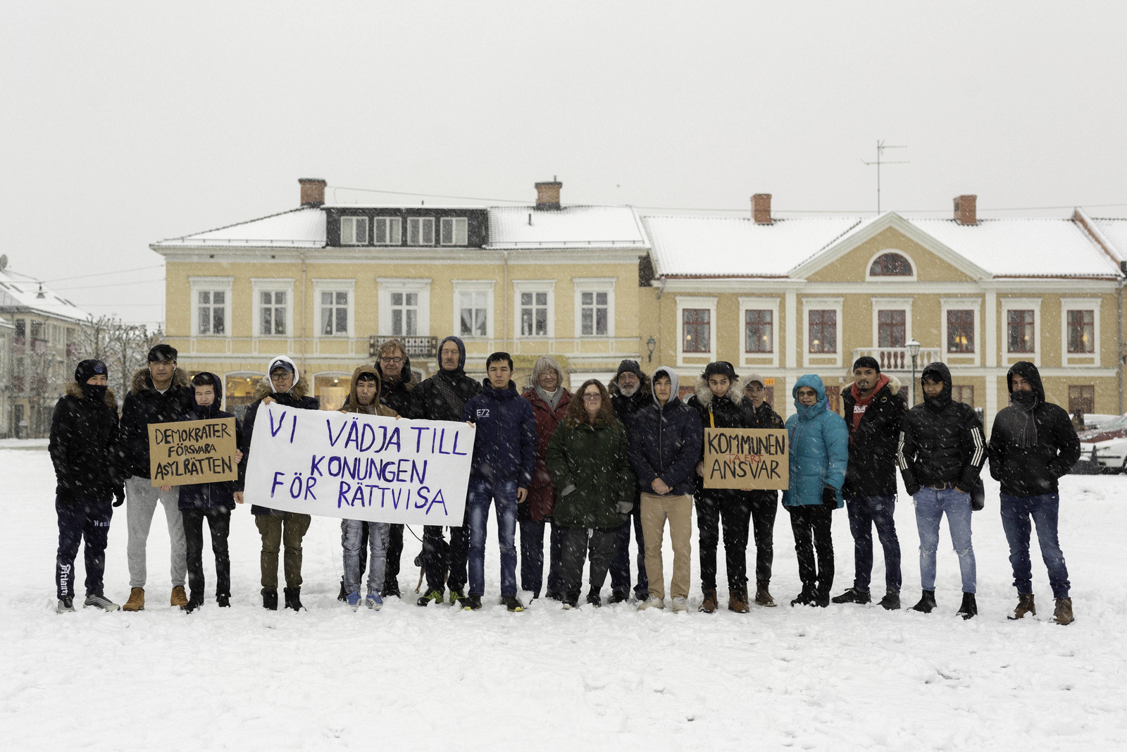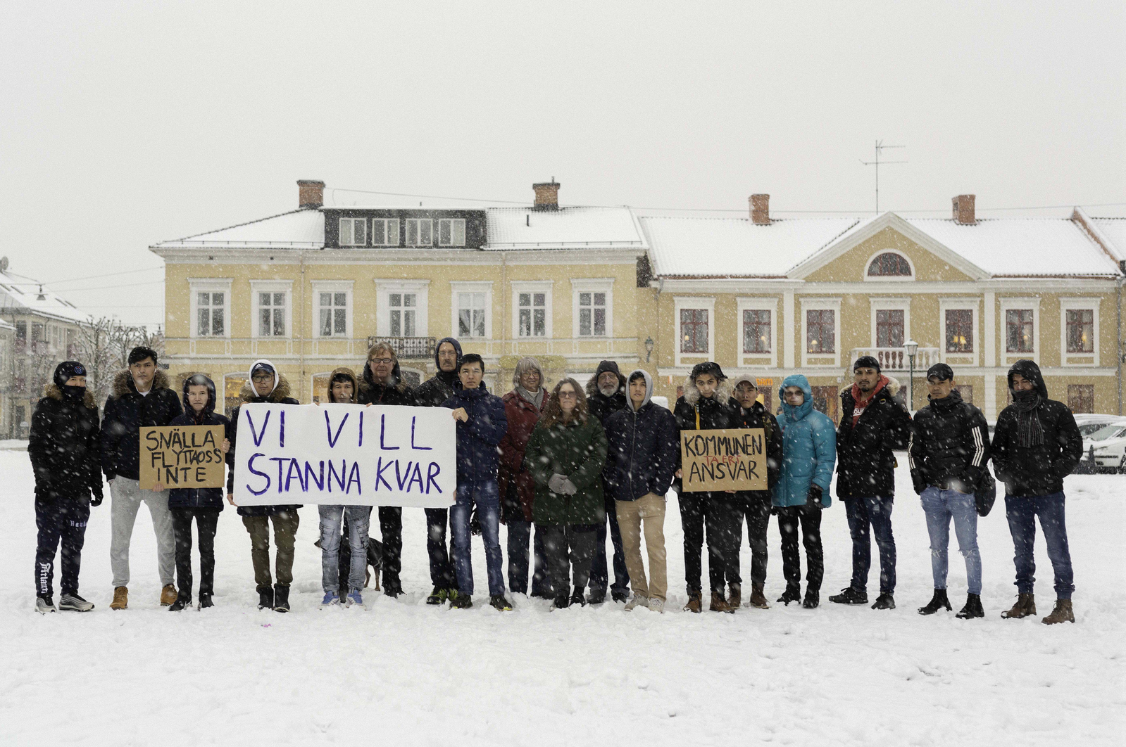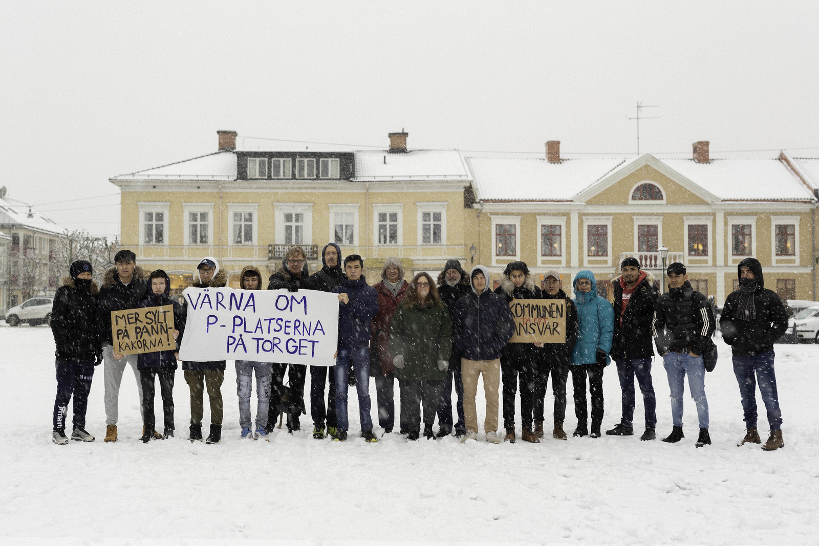 I de olika fotografierna ses ungdomarna bära på tre olika uppsättningar banderoller. Den ena med slagord de själva använt under sina manifestationer, den andra med slagord som användes under manifestationer mot Baltutlämningen och den tredje med kommentarer från invånare och politiker om vad kommunen bör satsa på och vad torget egentligen borde användas till.