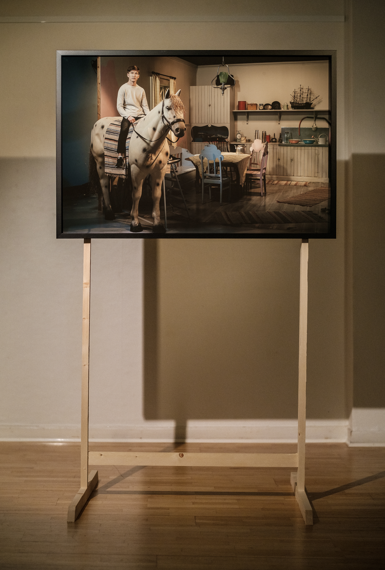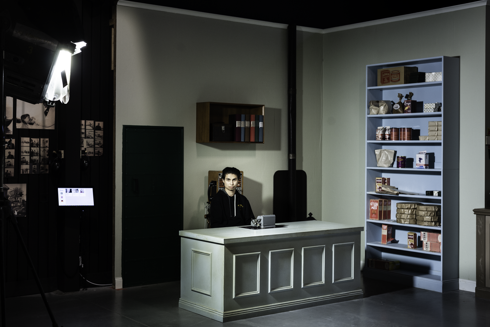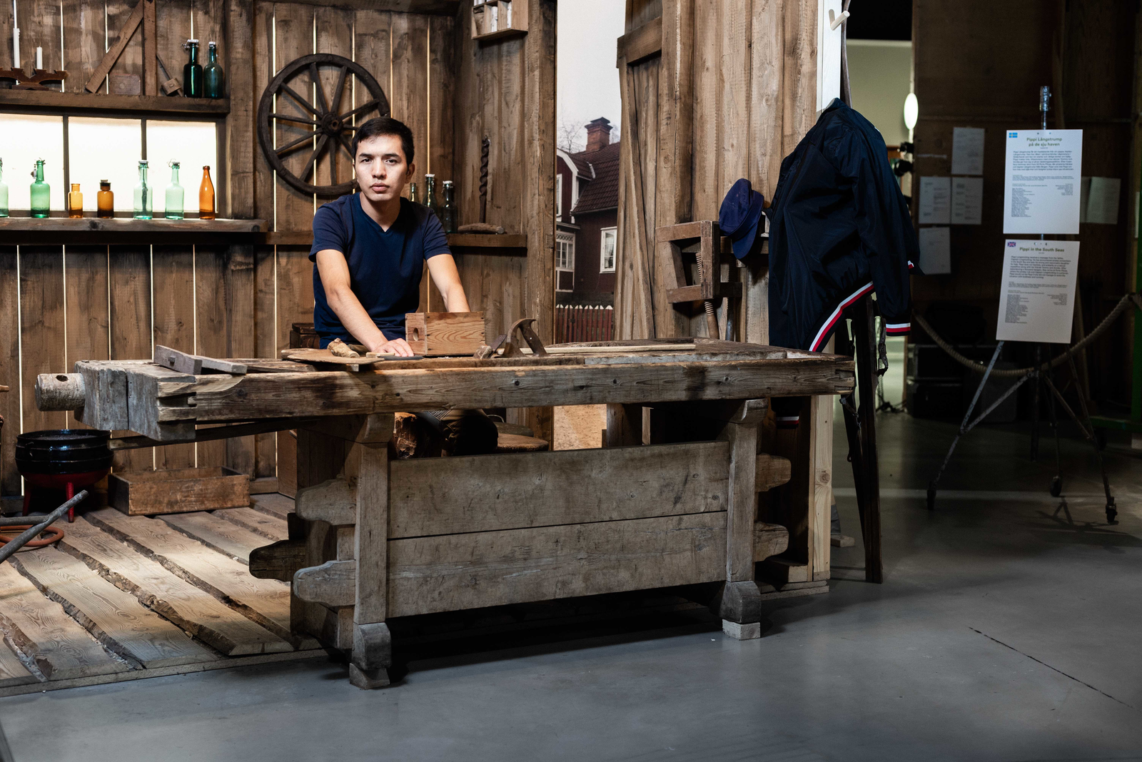 “Om man inte har mat i magen eller tak över huvudet vill man väl inte åka till Liseberg” Föreningen Kvar i Eksjö startade efter att två personer upptäckt flera hemlösa ungdomar i Eksjö. Föreningen anmodades av kommunen att söka bidrag för att hjälpa ungdomarna. Bidraget de beviljades fick inte användas till mat och husrum utan till aktiviteter och utflykter. Fotografierna är från Filmmuseet i Mariannelund, och är ett iscensättande av ett av de ensamkommande killarnas utflyktsmål baserat på dessa bidrag. Fotografierna är tagna i samspel med tre av de ensamkommande ungdomarna jag har arbetat med från Eksjö.