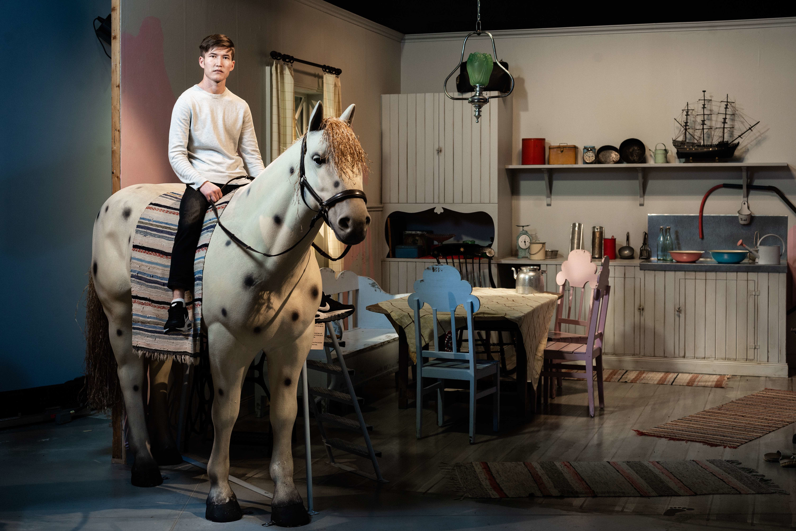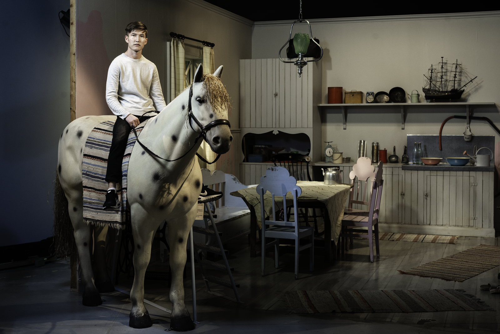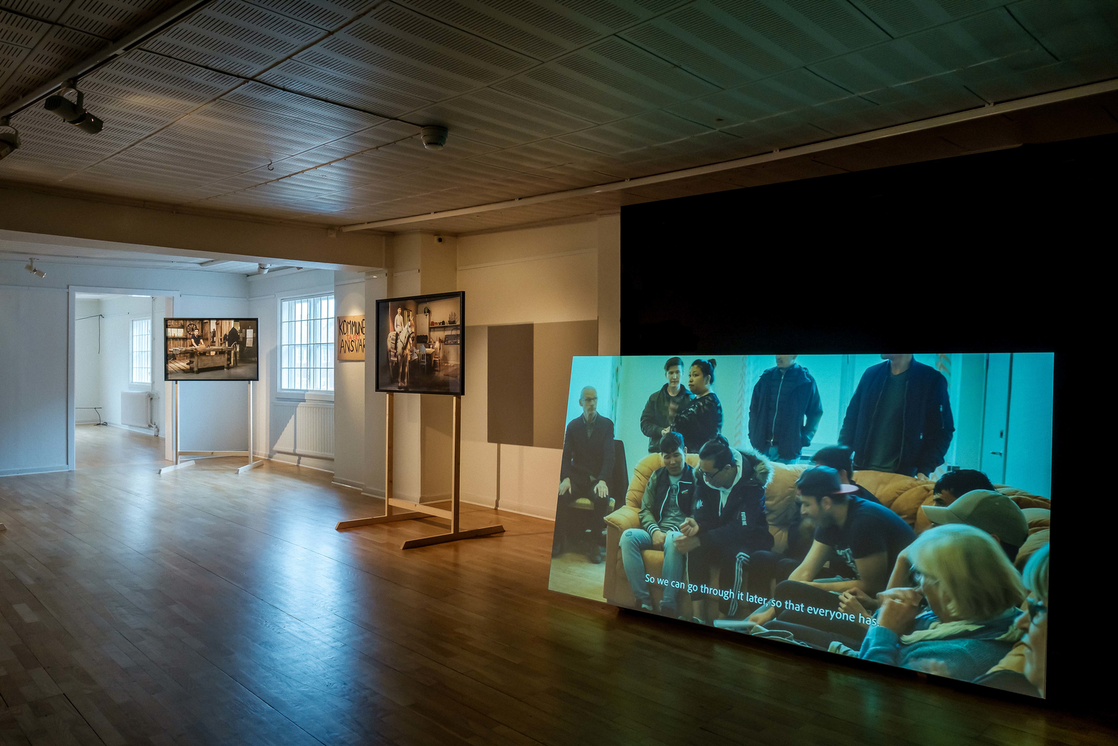 “Om man inte har mat i magen eller tak över huvudet vill man väl inte åka till Liseberg” Föreningen Kvar i Eksjö startade efter att två personer upptäckt flera hemlösa ungdomar i Eksjö. Föreningen anmodades av kommunen att söka bidrag för att hjälpa ungdomarna. Bidraget de beviljades fick inte användas till mat och husrum utan till aktiviteter och utflykter. Fotografierna är från Filmmuseet i Mariannelund, och är ett iscensättande av ett av de ensamkommande killarnas utflyktsmål baserat på dessa bidrag. Fotografierna är tagna i samspel med tre av de ensamkommande ungdomarna jag har arbetat med från Eksjö.