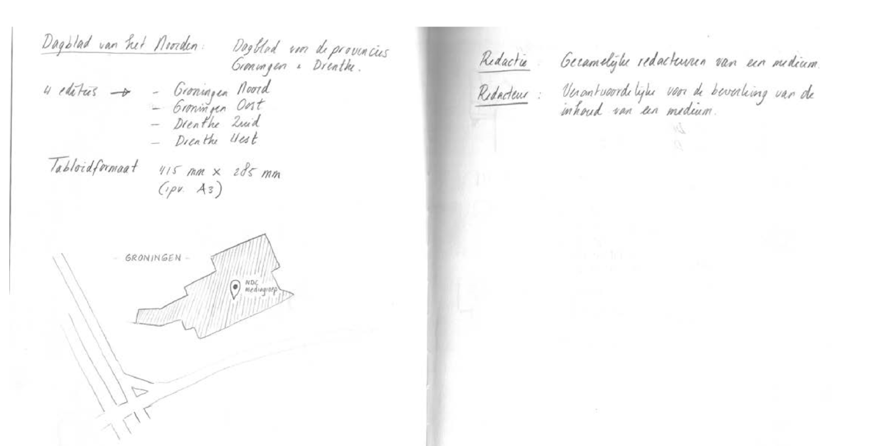 We invite you to join us on a walk to trace how this group of journalists perceive, articulate, engage, embrace, challenge, are receptive to and give form to the 'atmospheres' of their workspace. Atmospheres is a central way in which we have looked at the newsroom and you can find more information on it here. On this walk, we explore the spatial, socio-cultural, rhythmic, tonal and somatic characteristics of Dagblad van het Noorden’s newsroom – through video, sound, text, and drawing. Employing artistic methods, we want to let you experience this newsroom together with us – giving you insight into the journalists’ lived experience of their profession as fundamentally interwoven with the idiosyncrasies of their workspace.