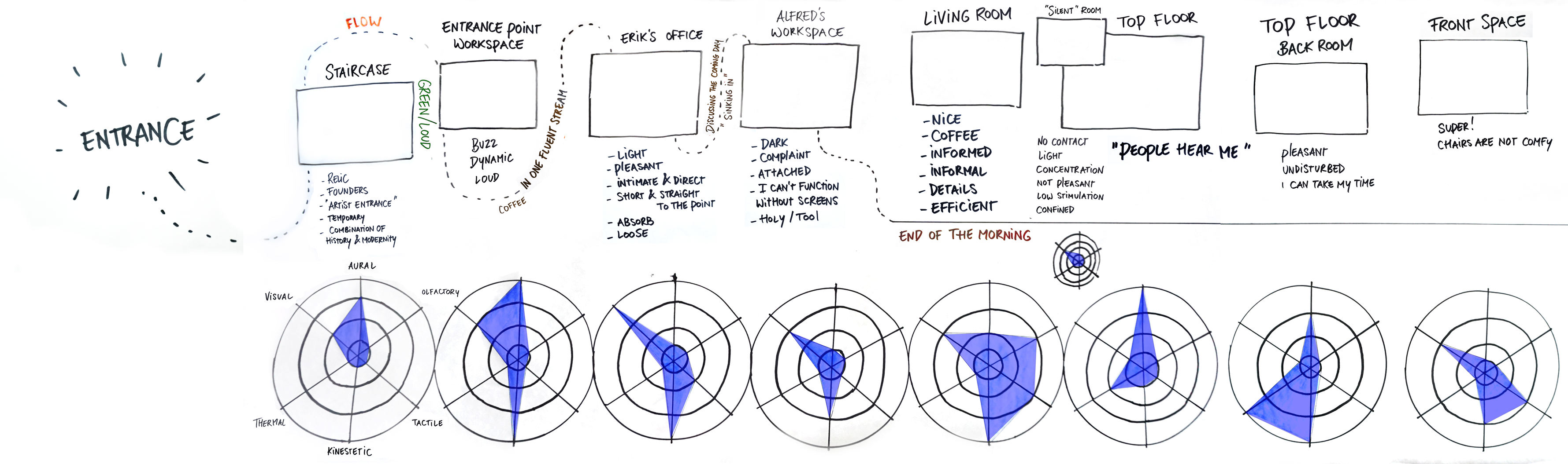 We invite you to join us on a walk through the newsroom of a regional newspaper, Dagblad van het Noorden. We trace how the journalists perceive, articulate, engage, embrace, challenge, are receptive to, and give form to the ‘atmospheres’ of their workspace. The concept of atmospheres is central in how we have looked at the newsroom. On this walk, we explore the spatial, socio-cultural, rhythmic, tonal, and somatic characteristics of the recently redesigned newsroom, using video, sound, text, and drawing. Employing artistic methods, we want to let you experience this newsroom together with us – giving you insight into the journalists’ lived experience of their profession as fundamentally interwoven with the idiosyncrasies of their workspace. Our host on the walk is online news editor Alfred Meester. Alfred walked us, Saskia and Sander, through the newsroom, which we visited as part of the project Exploring Journalism’s Limits (funded by the Dutch Research Council, NWO, project number: 314-99-205). Also joining us on this day is Ricky Booms, a visual artist invited to reflect on the space alongside us. Along the way, we encounter visual editors, interns, freelancers, editorial staff writers, and learn about the kinds of spaces that resonate with them. The walk takes approximately 45 minutes.