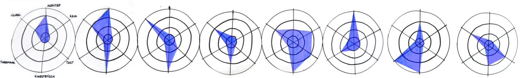 Based on the sensory walk, we plotted which of the senses appeared to be most important for the editor, highlighting how we can identify multiple atmospheres in the open space newsroom, as perceived and – as we indicate below – created by Alfred. Alongside video recordings, Ricky’s artistic drawings, and the deep map as such, these radar-like sensory charts tease out the multiplicity of experiences and representations of the newsroom.