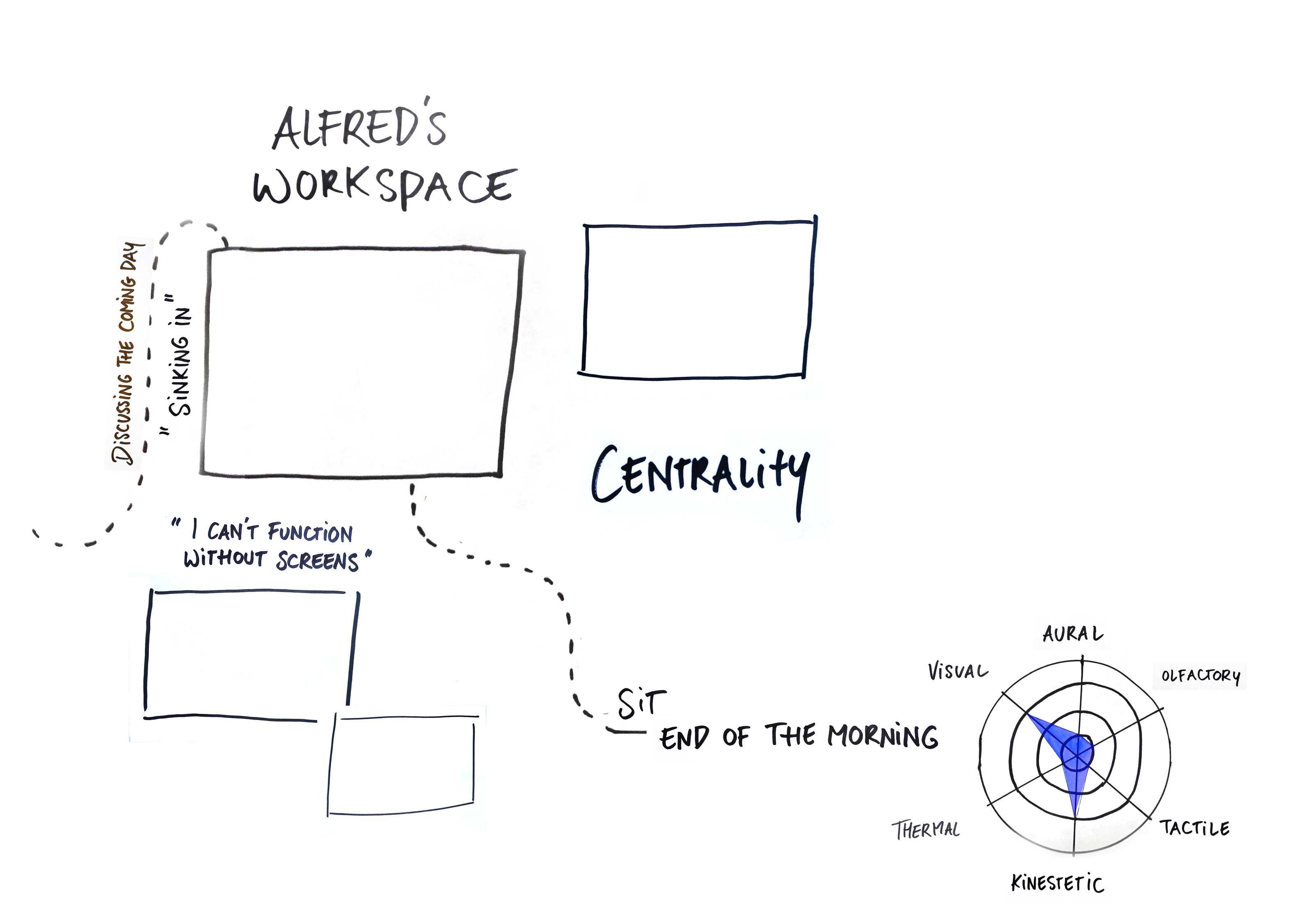 Throughout our research visits, we found that it is particularly important to consider sonic atmospheres, not only because hearing is a prominent sense, but also because the newsroom’s inhabitants repeatedly refer to sound. Specifically, sonic atmospheres play a key role in seeking the ‘right’ kind of environment for journalistic work: some journalists prefer silence, while others thrive in a context of buzz, and these inclinations call for a different engagement with space. This is not merely a matter of sensory preference: as we found in our research, it is also related to normative understandings of what journalism is or should be.