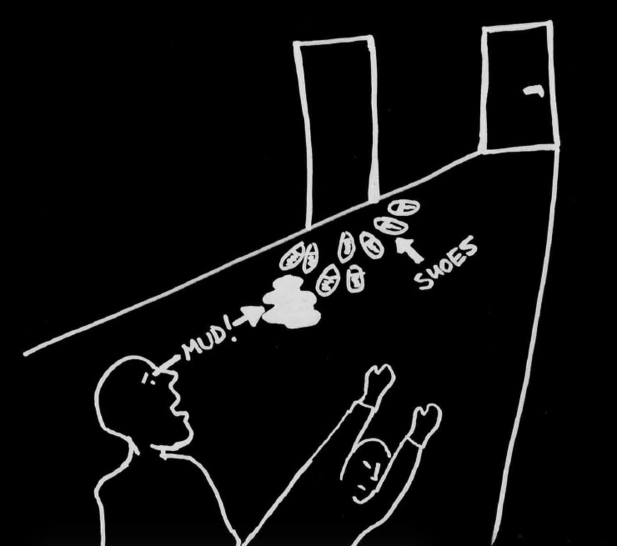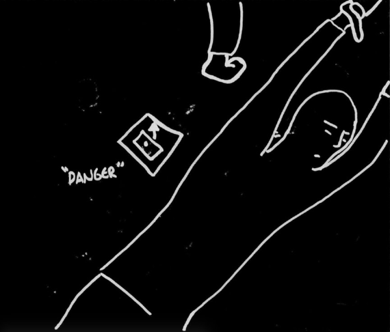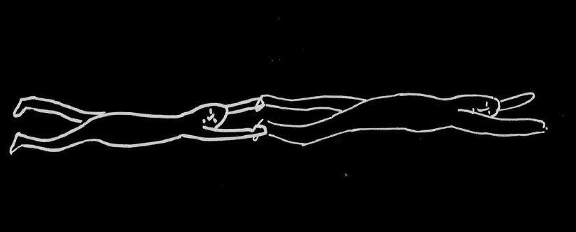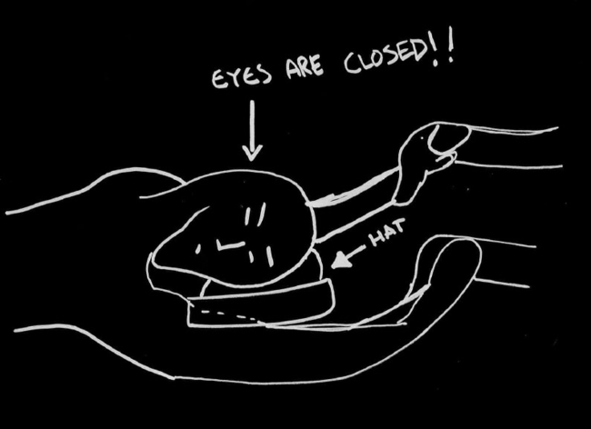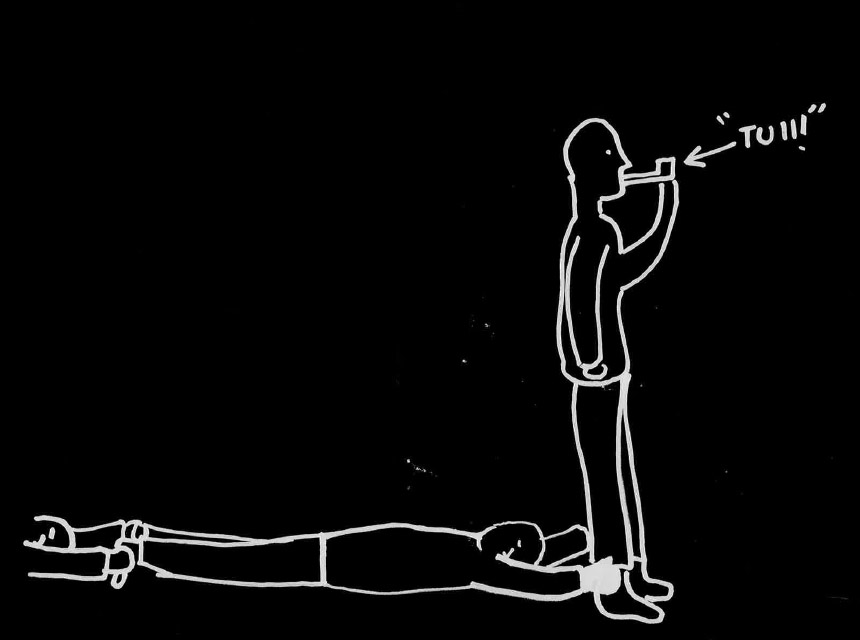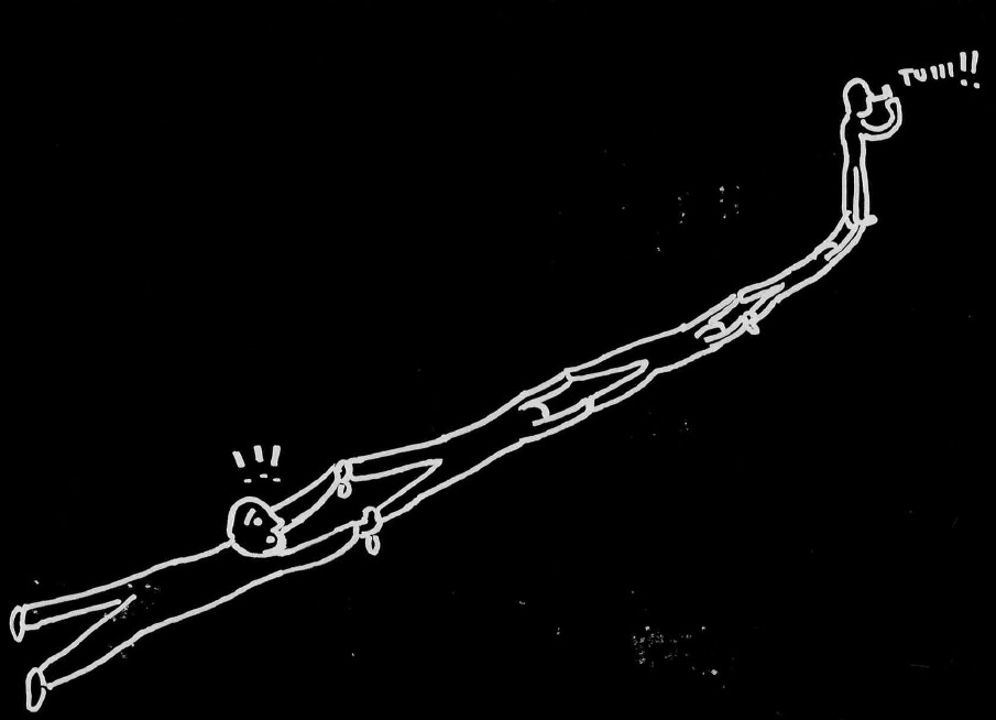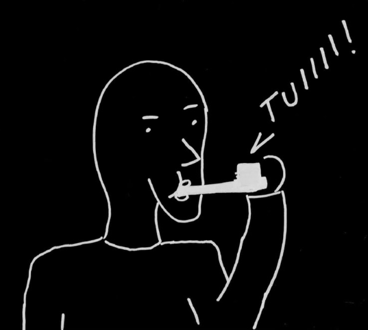 2. Jono muodostetaan takaa eteenpäin. Kun viimeinen asettuu jonon eteen, hän puhaltaa äänimerkin pilliin (kuvassa "kazoo") ja asettuu makaamaan.