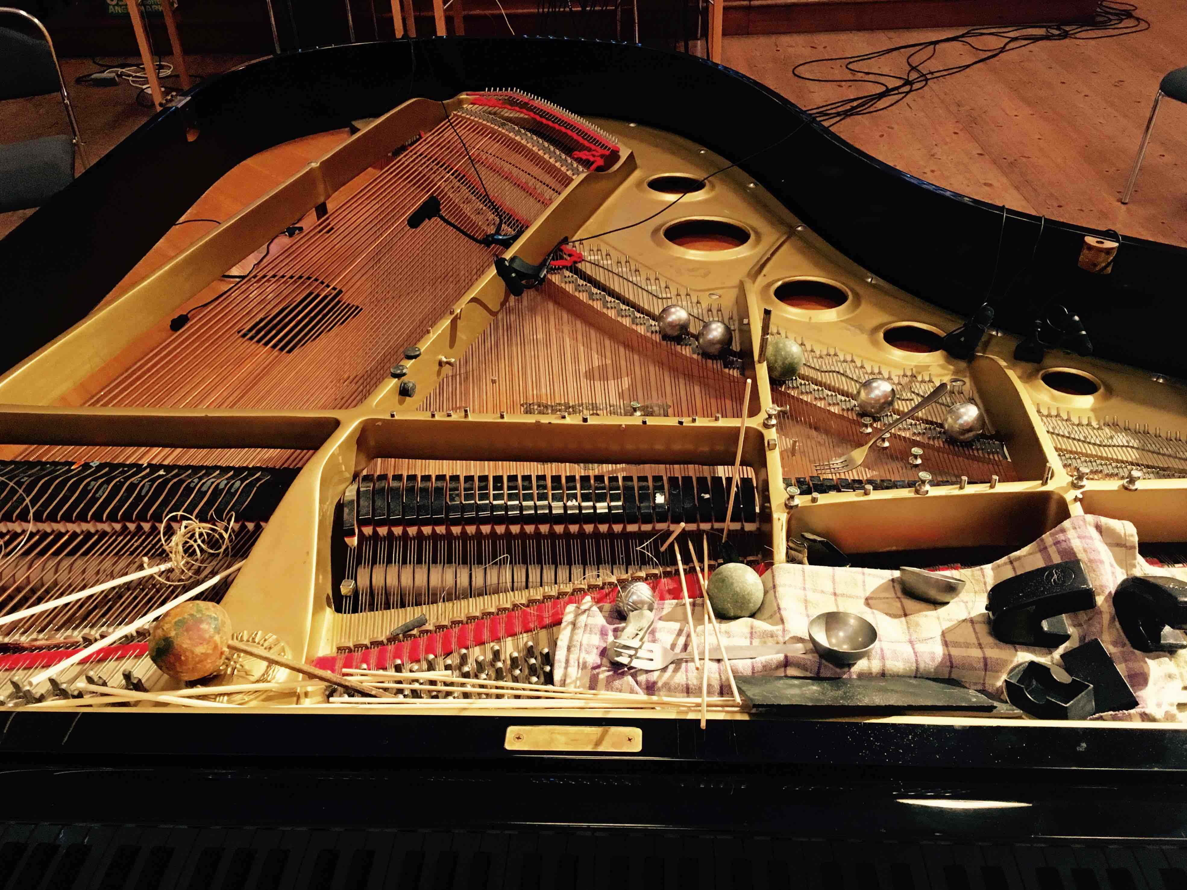 In my practice, I have developed and expanded the vocabulary for inside piano playing[2] using preparations and objects that become extensions of the instrument itself. I experiment with a grand piano, objects, microphones, speakers, movement and space. I do not divide these elements into (passive) objects and (active) subjects but rather treat them as changing configurations of dynamic relationships. The relationship between these elements and their subsequent relationship to me is in constant flux and, with it, my role as a performer and listener.