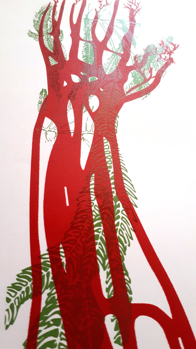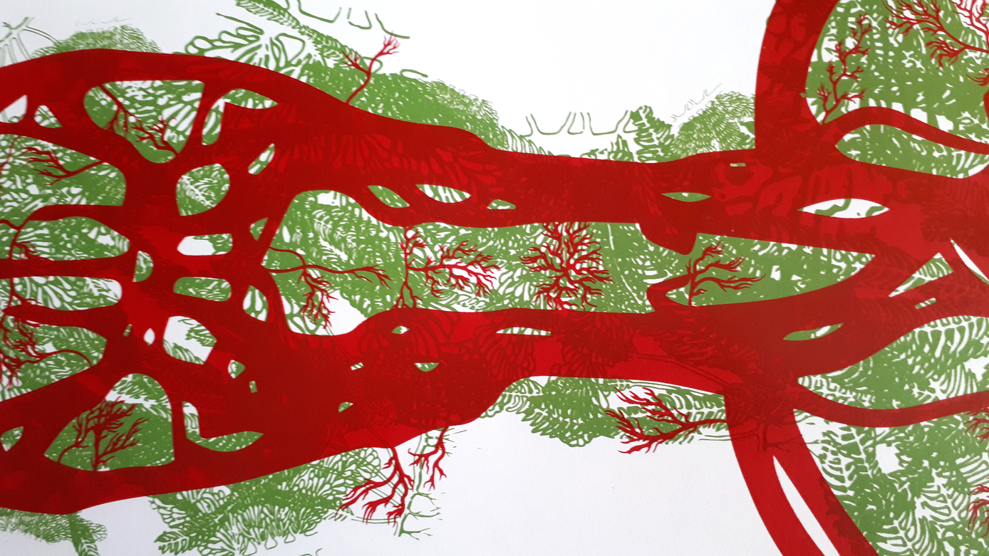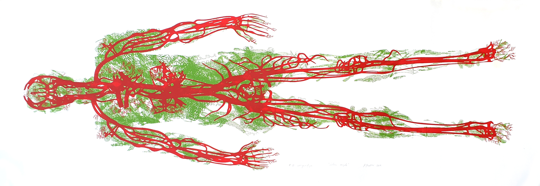 The work made in the screen printing graphic technique shows a silhouette of a man that is laid horizontally - floating, levitating and "protected" in space. However, by carefully observing the silhouette of the man, his circulatory system is complemented by multiple lines "aesthetically decorated" by the algae. An ironic scene invites the viewer to participate. The covered plexiglass surface also contains lines. But here, these lines represent the link to the voices that are not heard and the tone in which the research ended due to a lack of finances and support and further interest in research. By touching the lines made from electricity-conducting paint and printed on the plexiglass display, a circuit is created and indeed, the lines transmit the sound and voice of Dr. Petra Marić and her research. The layout of the man is a silhouette by its Ms. Sladetić that continues the "Habibti" work from 2006, made by Algerian artist Adel Abdessemed who often questions issues of politics and social exclusion. The glass silhouette of his wife in the work "Habibti” floats in space and, like this work, the author wants to evoke not only the natural course of life that is fragile and absolute, as well as communication and togetherness. “The Green Man“ art work reveals a critique of environmental scientific research in Croatia and the world which is otherwise hidden within the scientific community and is not publicly disclosed. The voice that exposes this criticism is activated by touching the lines on the plexiglass which motivates the observer to participate, thus making him indifferent to the work itself. This art work encourages passive observation. By consciously participating and touching the lines and through the research content itself, the art work seeks to achieve cooperation independent of knowledge in both scientific and artistic research. The art work contains real environmental research, the layout of a man – as a symbol of the endangered, but also responsible for the pollution, and the line = the voice of revelation. In this work, the circulatory system of the human body becomes a symbol of the aquatic environment that is devastated by algae that spread uncontrollably and like a dense carpet cover every part of the human body, as they do in the seas and oceans. The invasion of algae that are attacking the man is hidden in this artistic work deep within the human body, just like at the bottom of the ocean. It signifies an "unhealthy" condition that is far from the surface and eyes of the public. The purpose of this artistic work is to show the actual situation where algae replicate dominant human behavior based on power and inequality and the presence of an invasive, competitive and toxic state in scientific and artistic research practice. Using the links in the work or its lines of voice, the observer is invited to discover the real truth and actual state of research as it really is.