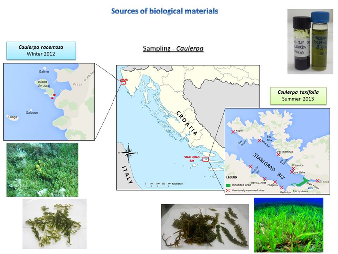 At the Rudjer Boskovic Institute Dr. Petra Marić conducted research from 2012 to 2015 studying these algae (Marić, 2015; Marić et al, 2017). The main purpose of this research was to test the toxicity of the invasive green tropical algae from the genus Caulerpa: C. taxifolia and C. racemosa that differ in localities within the Adriatic Sea from which they were taken (Stari Grad, Hvar and Vrsar, Istra). Algae from the genus Caulerpa are known for their ability to produce toxic compounds that can significantly disturb the balance of the local ecosystem and impact the health of humans and animals, especially during periods of its intensive blooms. These toxic compounds serve algae as a chemical defense mechanism against herbivores and competitors and greatly contribute to the invasive behavior of the algae.