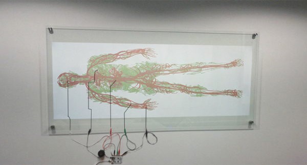 The work made in the screen printing graphic technique shows a silhouette of a man that is laid horizontally - floating, levitating and "protected" in space. However, by carefully observing the silhouette of the man, his circulatory system is complemented by multiple lines "aesthetically decorated" by the algae. An ironic scene invites the viewer to participate. The covered plexiglass surface also contains lines. But here, these lines represent the link to the voices that are not heard and the tone in which the research ended due to a lack of finances and support and further interest in research. By touching the lines made from electricity-conducting paint and printed on the plexiglass display, a circuit is created and indeed, the lines transmit the sound and voice of Dr. Petra Marić and her research. The layout of the man is a silhouette by its Ms. Sladetić that continues the "Habibti" work from 2006, made by Algerian artist Adel Abdessemed who often questions issues of politics and social exclusion. The glass silhouette of his wife in the work "Habibti” floats in space and, like this work, the author wants to evoke not only the natural course of life that is fragile and absolute, as well as communication and togetherness. “The Green Man“ art work reveals a critique of environmental scientific research in Croatia and the world which is otherwise hidden within the scientific community and is not publicly disclosed. The voice that exposes this criticism is activated by touching the lines on the plexiglass which motivates the observer to participate, thus making him indifferent to the work itself. This art work encourages passive observation. By consciously participating and touching the lines and through the research content itself, the art work seeks to achieve cooperation independent of knowledge in both scientific and artistic research. The art work contains real environmental research, the layout of a man – as a symbol of the endangered, but also responsible for the pollution, and the line = the voice of revelation. In this work, the circulatory system of the human body becomes a symbol of the aquatic environment that is devastated by algae that spread uncontrollably and like a dense carpet cover every part of the human body, as they do in the seas and oceans. The invasion of algae that are attacking the man is hidden in this artistic work deep within the human body, just like at the bottom of the ocean. It signifies an "unhealthy" condition that is far from the surface and eyes of the public. The purpose of this artistic work is to show the actual situation where algae replicate dominant human behavior based on power and inequality and the presence of an invasive, competitive and toxic state in scientific and artistic research practice. Using the links in the work or its lines of voice, the observer is invited to discover the real truth and actual state of research as it really is.