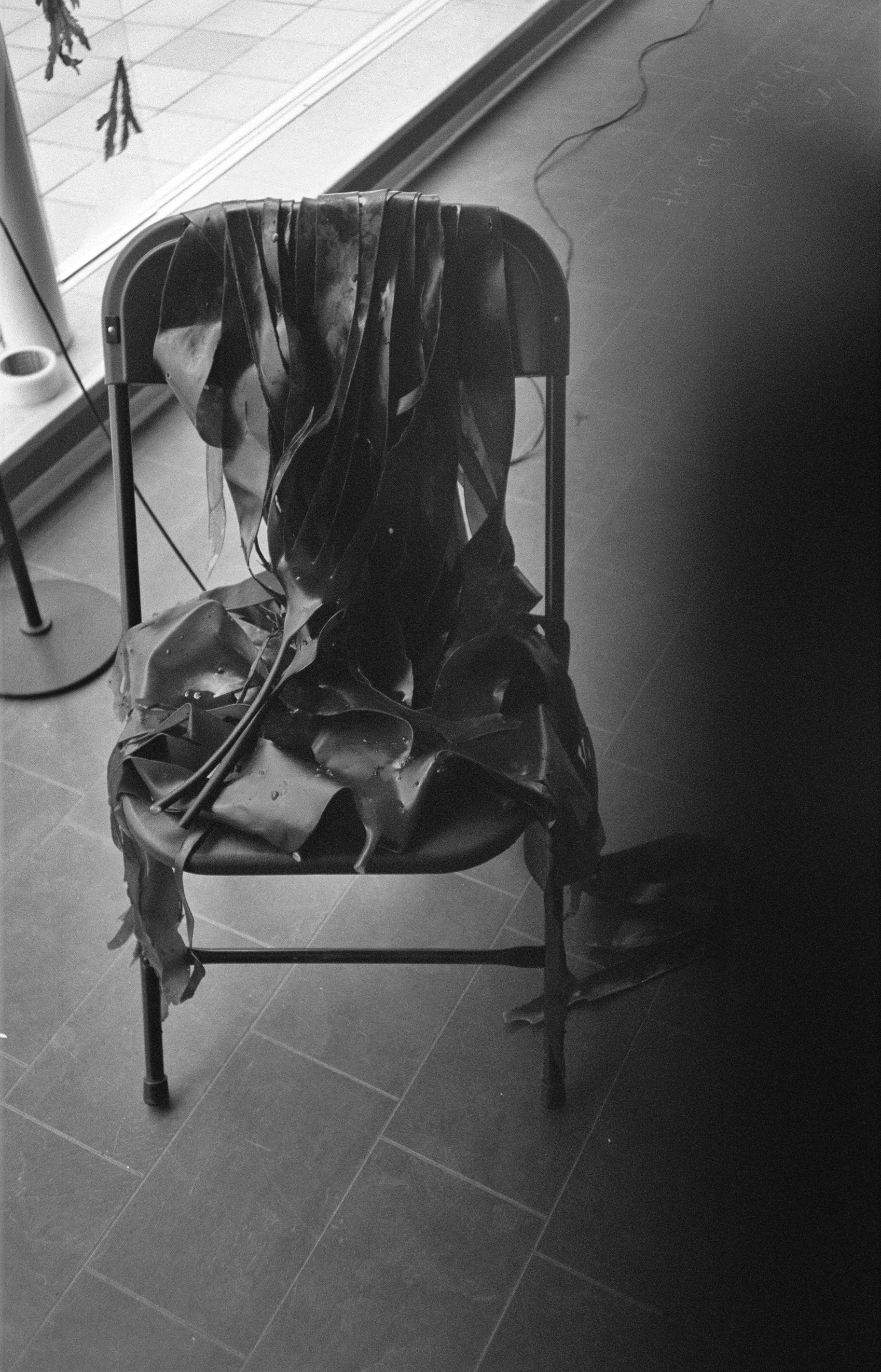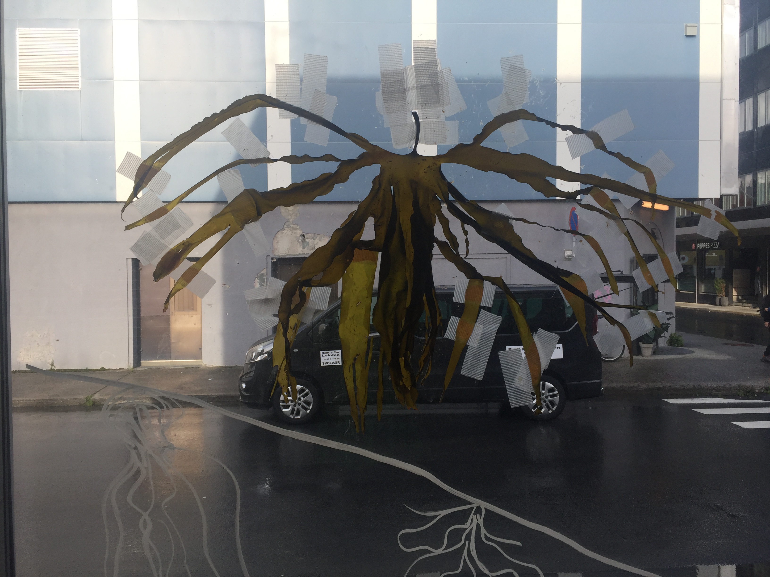 The iteration of the space that received the visitors on Saturday is still a prototype. Ideally, I understand spaces of art education must approximate themselves of the idea of prototyping (Corsin Jimenez, 2014), which means they are always in the beta phase. Again, it is common sense in contemporary art spaces that the practices are always part of a process that has no final destination, but what I would like to add is that this beta phase of the artistic process or arts hosting space extends itself to the modes of sociality together developed. Prototyping must mean understanding the agency of the non-human materialities and how they continue to develop independently of our interference. When we dealt with kelp, we experienced these shifts at a fast pace: the materiality of the algae quickly changes after it is removed from its habitat. When underwater and covered by the wet suits, we tend to feel its slipperiness, but in a way that let our entanglement quickly happen. Outside the seawater, these properties give place to a sliminess. More than the qualities our sense of touch can perceive, the smell released by the kelp being decomposed (or cooked) may not be suitable for all noses. In this process of rotting, the kelp-octopus creature started to release a dark and putrefied liquid into the window. After we left Lofoten on Sunday, all kelp assemblages stayed in the room. Rumours reached me that the octopus creature now reached the quality of dryness. Since most of kelp’s composition is water (like us), it is possible that the octopus may have shrunk and escaped the duct tape trap, possibly falling into the ground.