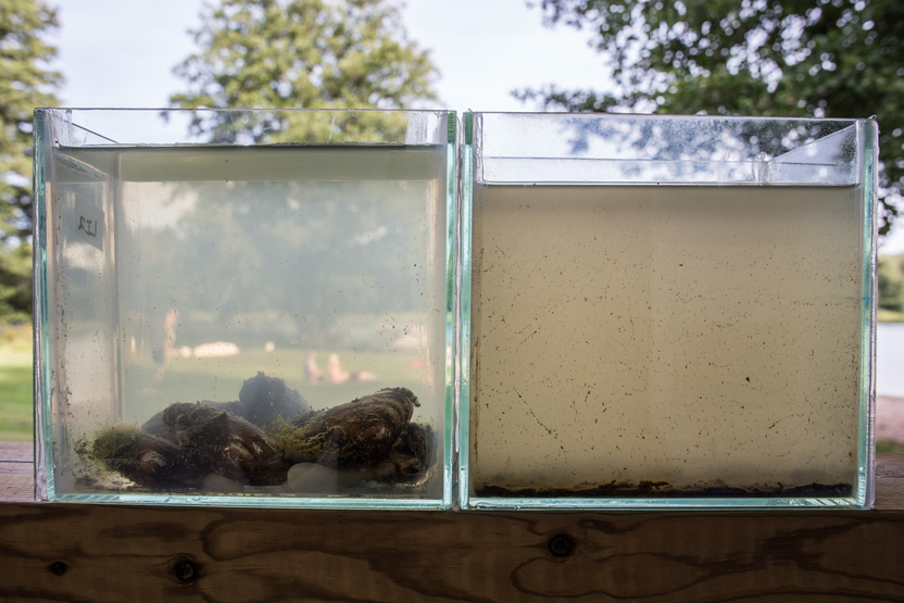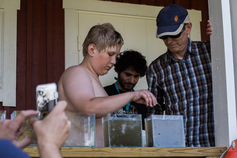 Photo 3. Professor Jouni Taskinen is showing how the mussels are cleaning the water. Photograph Fabio Cito.