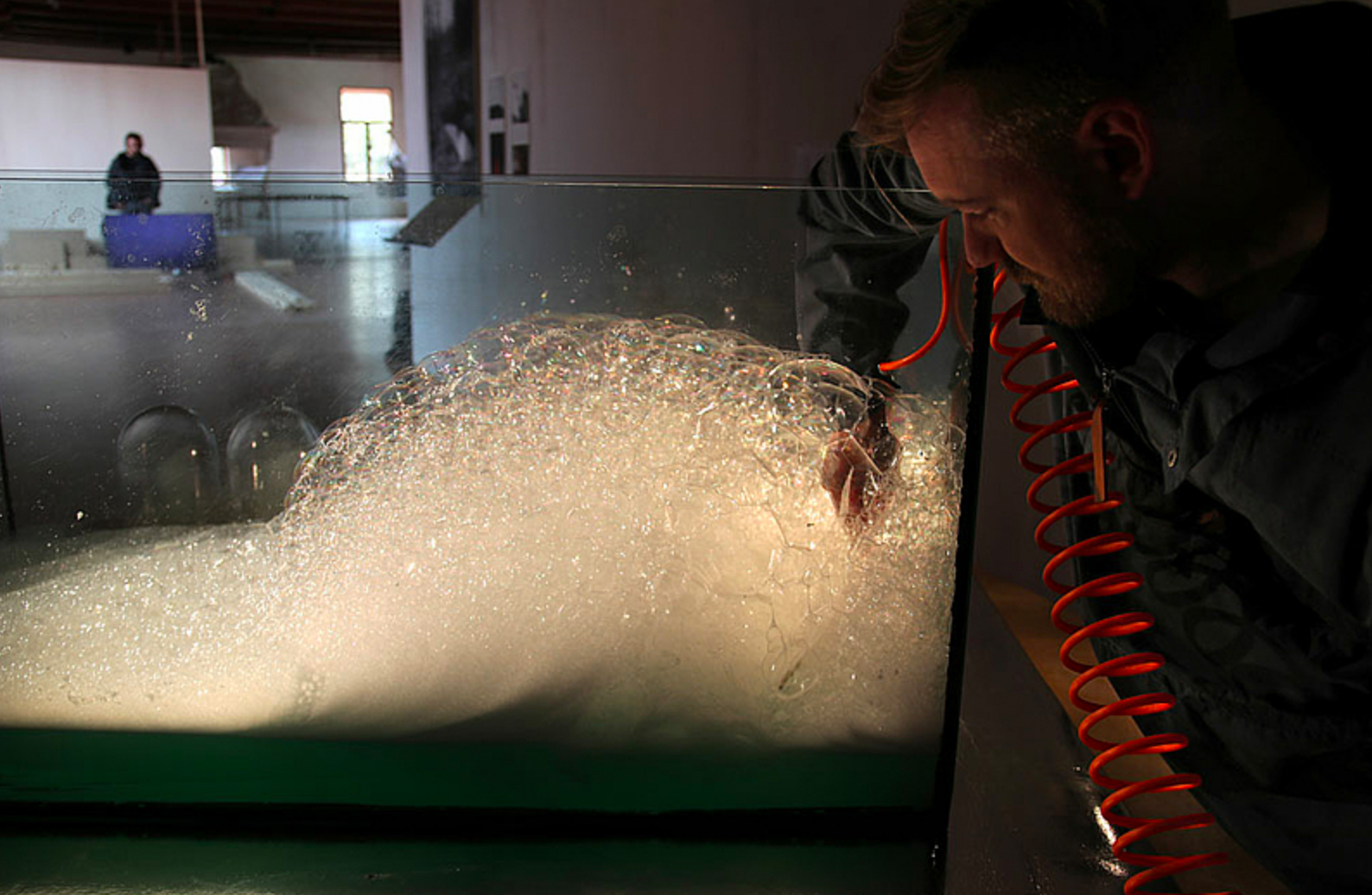 From day one it was crystal clear that the foam project would and should be playful, and include fictional dimensions in imagining and realizing foamy spaces and activities. Starting from the level of addressing the conditions of research in an academic grant application format as in “Investigating a Phenomenology of Foam. Needing to buy grand amounts of dishwashing detergent (preferably with organic composition). Needing to invest in a large aquarium and a powerful soap bubble blower”, something told me that there would be a proper amount of desired lightness to counterbalance the density and play of scale (between factual and fictional) in relation to the textual references.