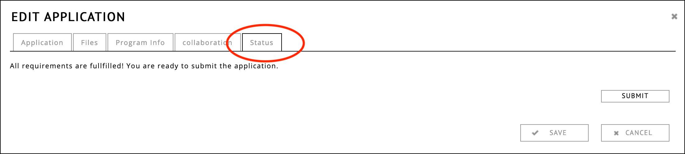An application has to be saved once before it can be submitted. Click the save button, this will save and close the application. After you open the application again (☰ > edit details), the “status” tab ( screenshot ) will have become active. The status tab allows you to submit the application, or it will show which required fields are still missing.