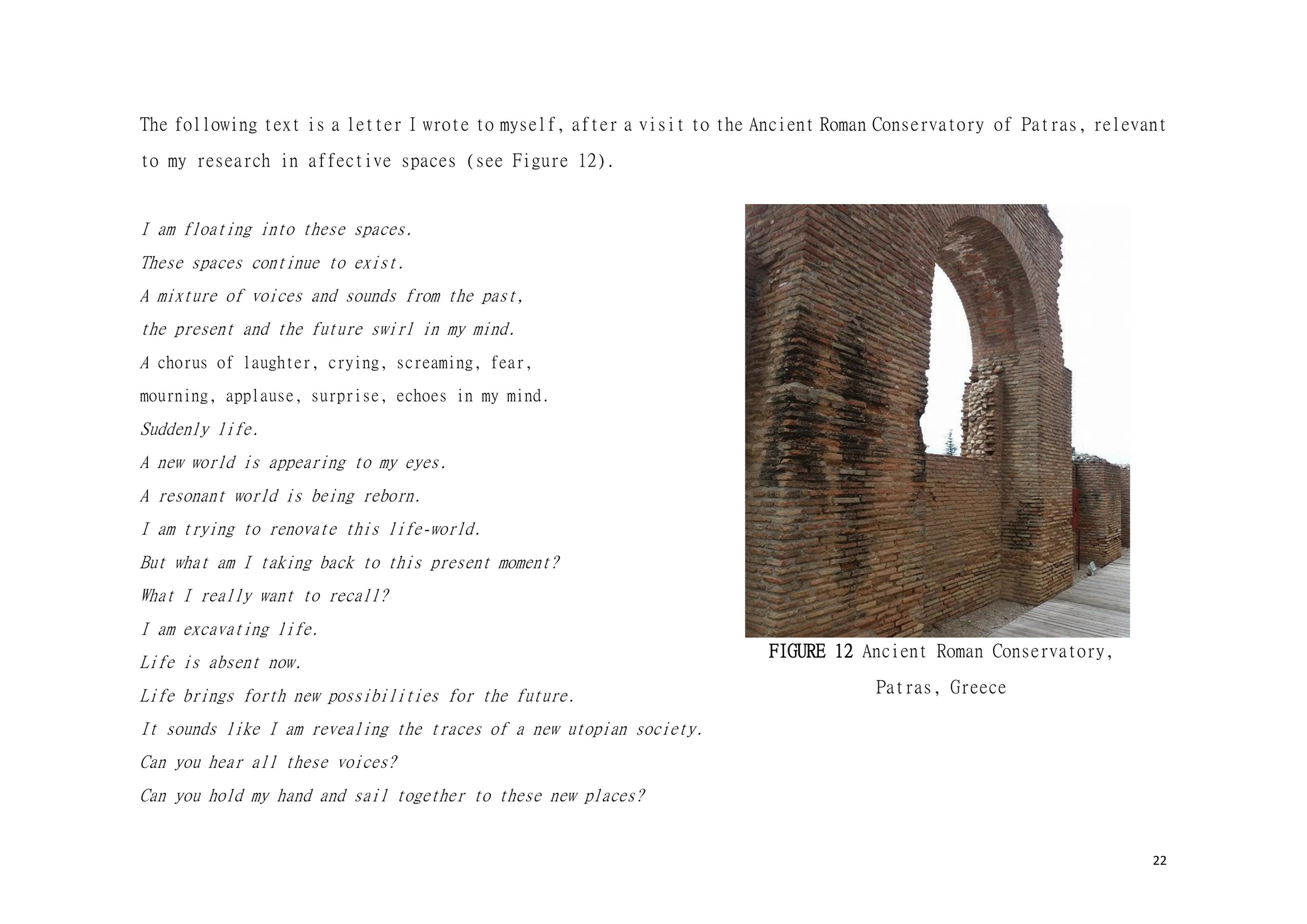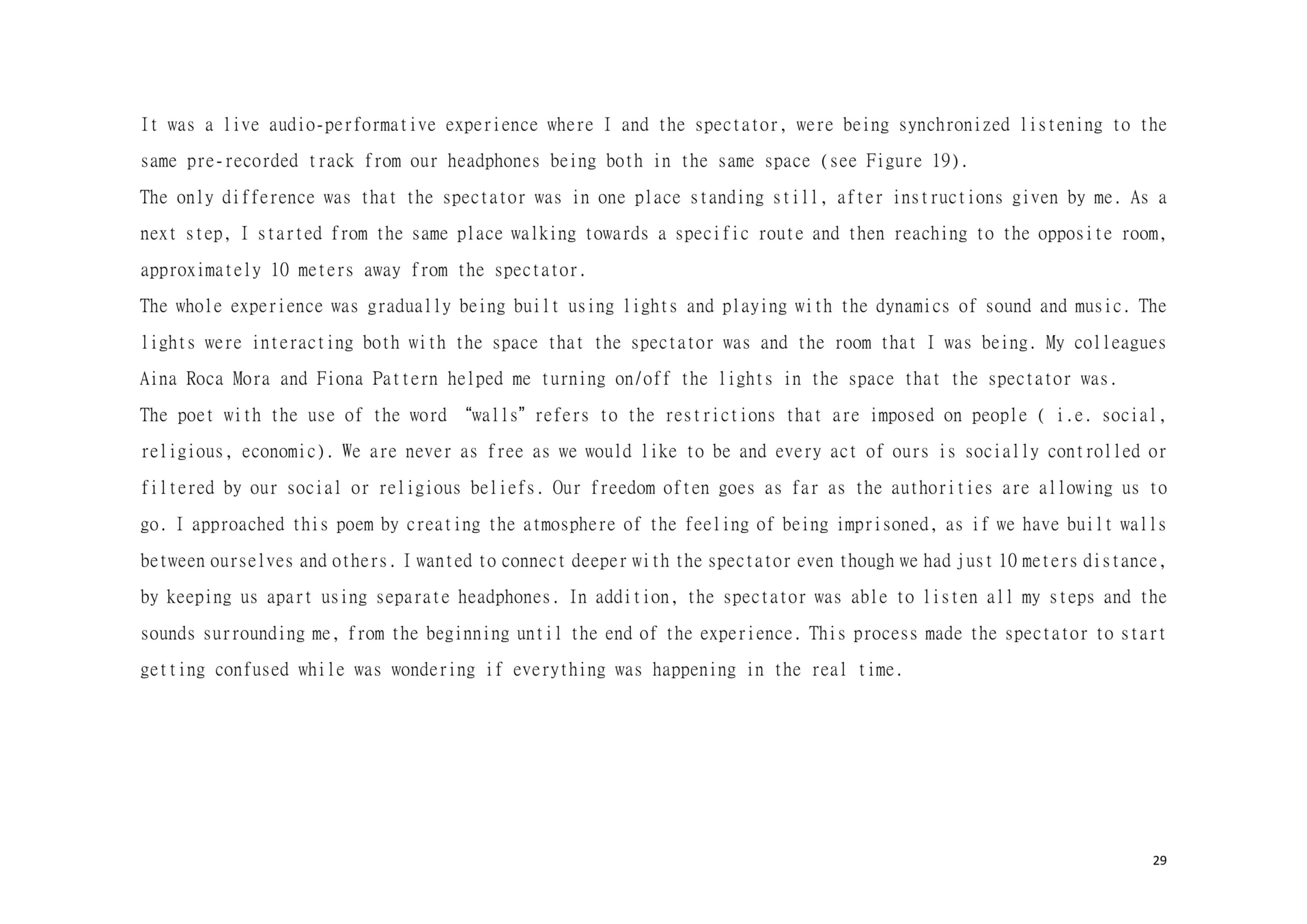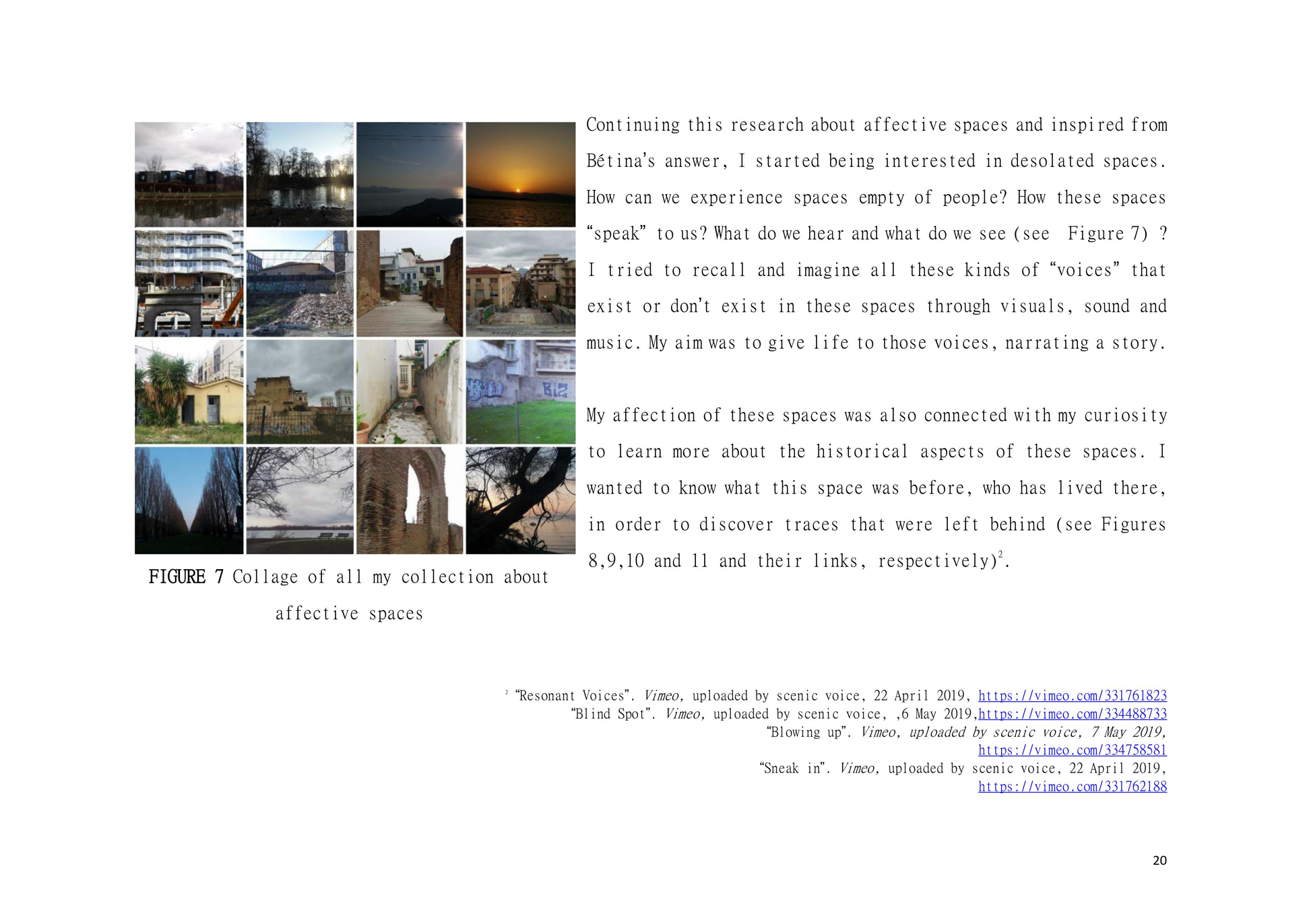 Dear Reader, This is a research about aesthetic and political scenography. This is an attempt to create awareness. This is a composition of images, sounds, and melodies through an imaginary and personal lens. This is a formulation of my artistic system. This is a mixture of concerns, questions and beliefs. This is my voice. This voice could be yours.