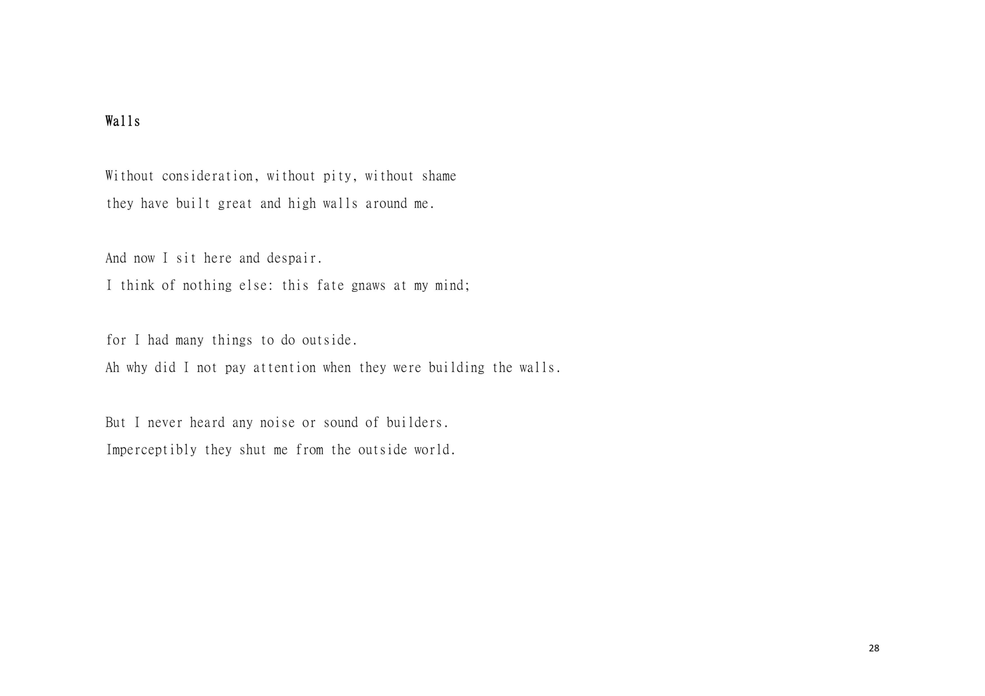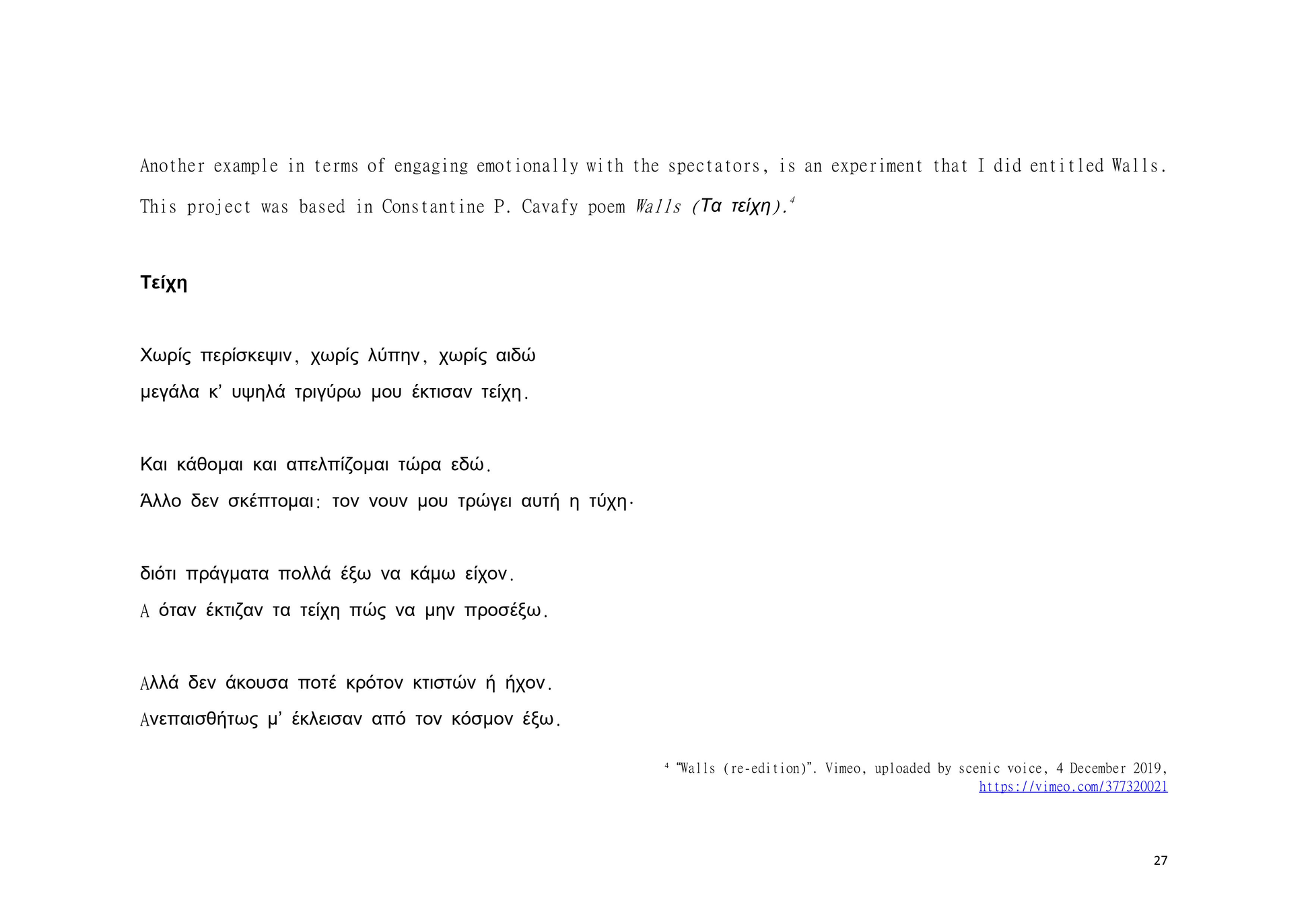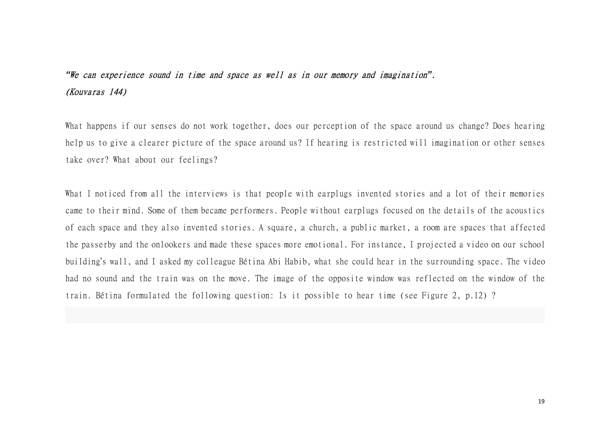 Dear Reader, This is a research about aesthetic and political scenography. This is an attempt to create awareness. This is a composition of images, sounds, and melodies through an imaginary and personal lens. This is a formulation of my artistic system. This is a mixture of concerns, questions and beliefs. This is my voice. This voice could be yours.