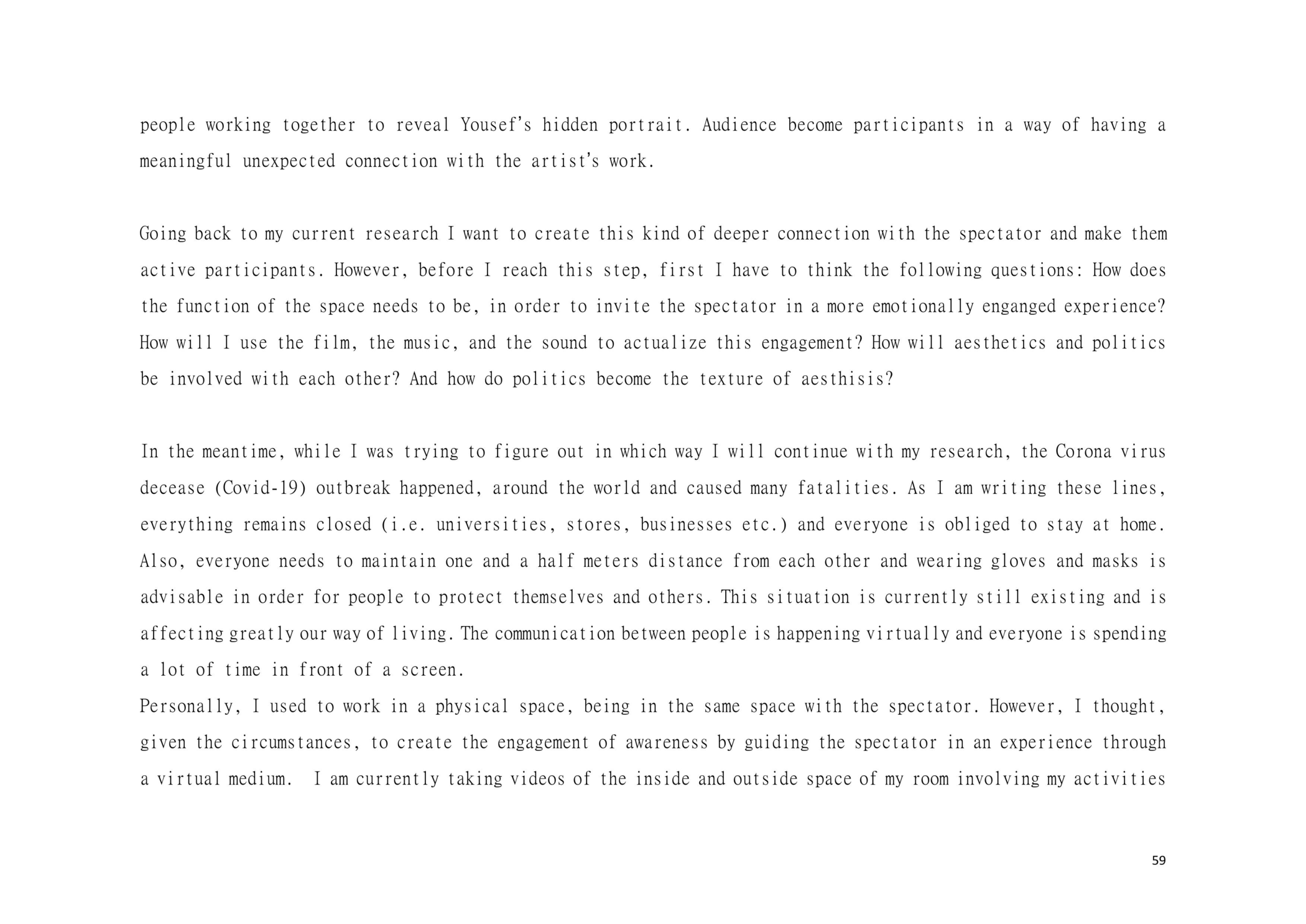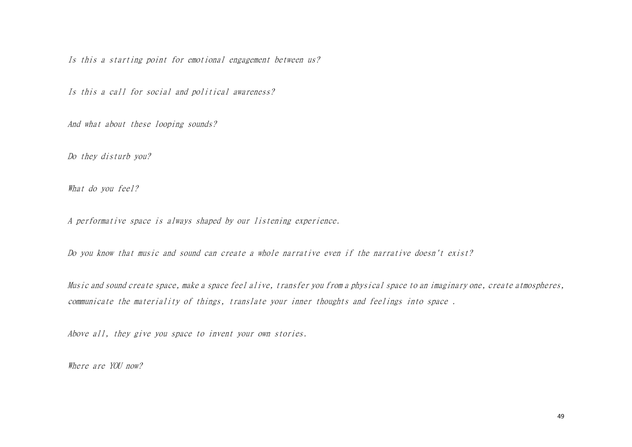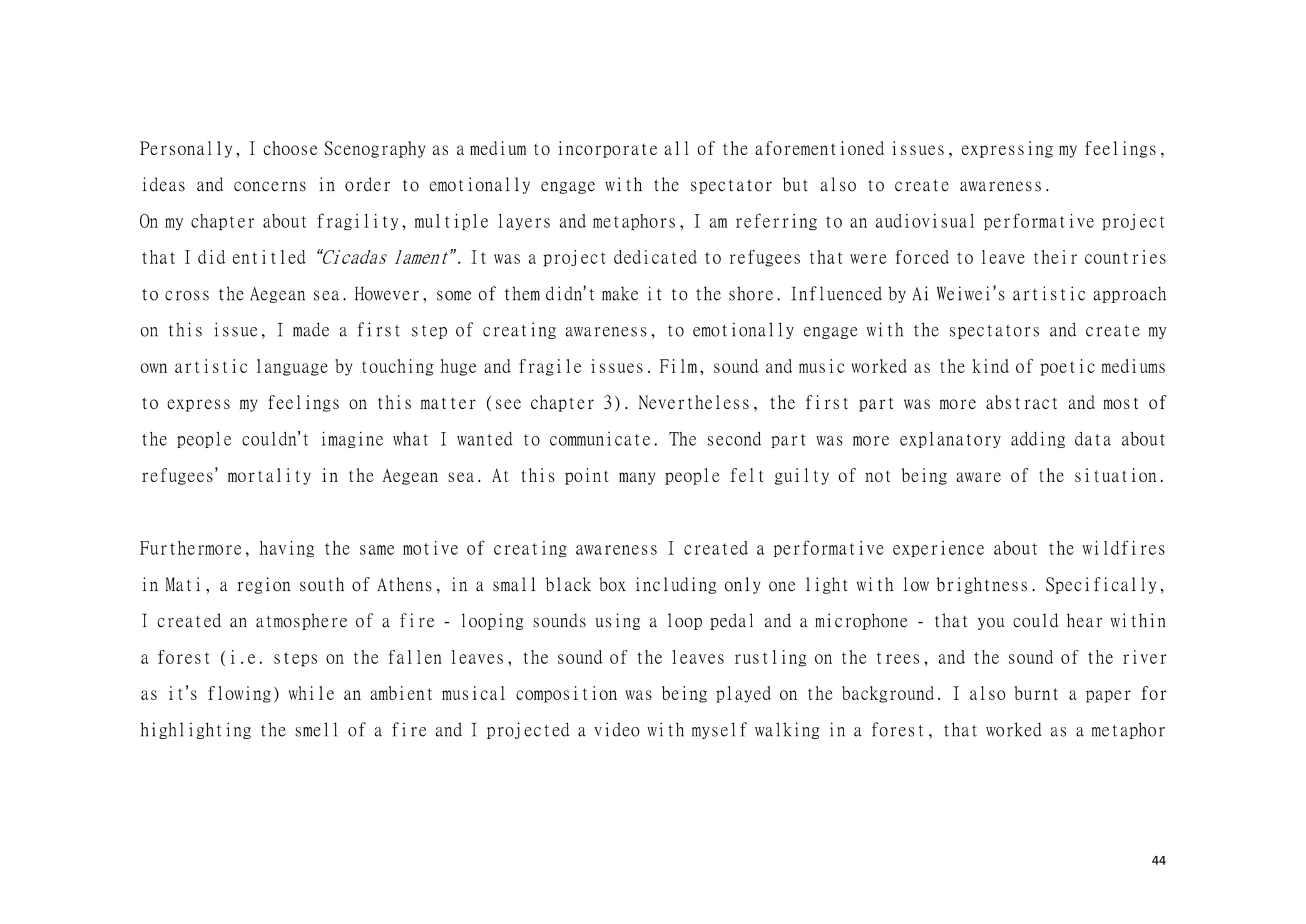 Dear Reader, This is a research about aesthetic and political scenography. This is an attempt to create awareness. This is a composition of images, sounds, and melodies through an imaginary and personal lens. This is a formulation of my artistic system. This is a mixture of concerns, questions and beliefs. This is my voice. This voice could be yours.