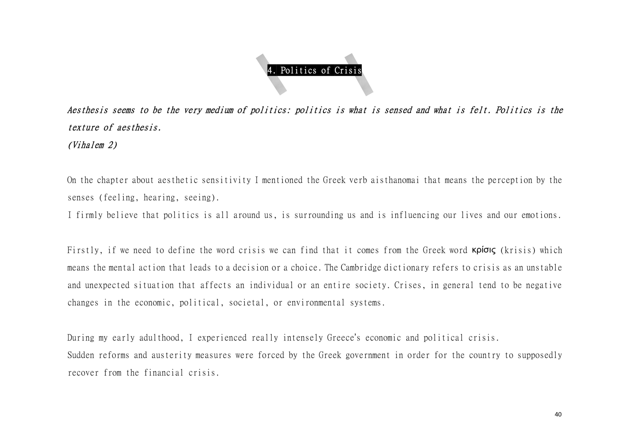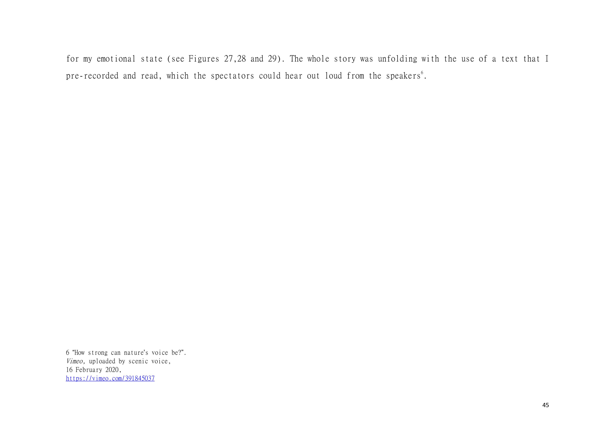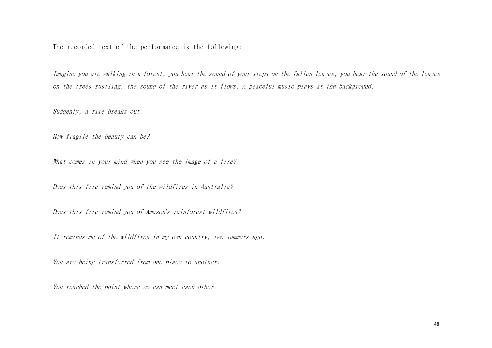 Dear Reader, This is a research about aesthetic and political scenography. This is an attempt to create awareness. This is a composition of images, sounds, and melodies through an imaginary and personal lens. This is a formulation of my artistic system. This is a mixture of concerns, questions and beliefs. This is my voice. This voice could be yours.