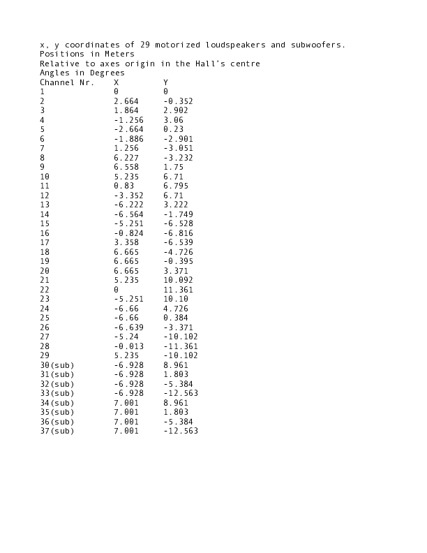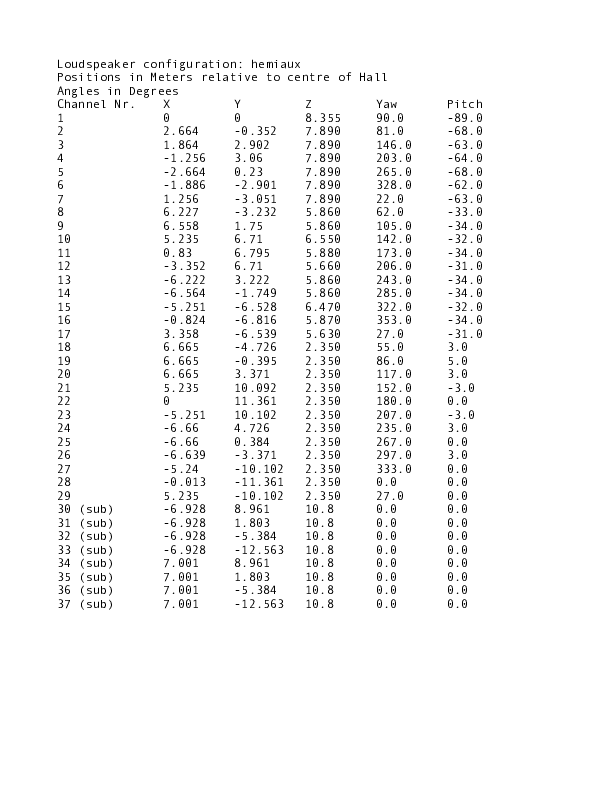 - hemiaux: simulates the 29 loudspeakers in a hemispherical configuration ("classical" dome arrangement used e.g. for ambisonics spatialisation), all facing the centre of the hall, plus the 8 subwoofers.