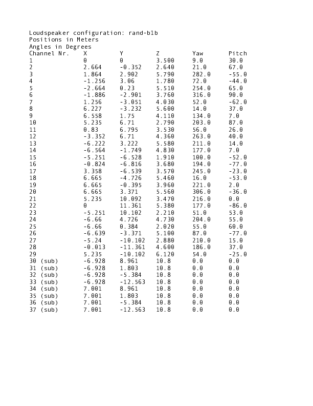 - rand-b1b: 29 loudspeakers, each one with random height, azimuth and tilt, plus the 8 subwoofers.