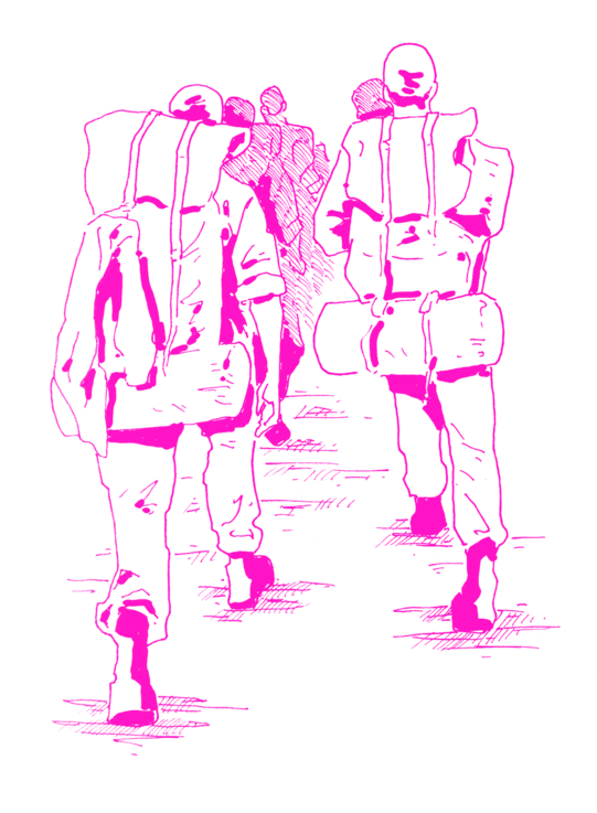 I stay at the back of the group when we begin marching. I do not know where I am supposed to be. Do I walk with them, as one of them, or at some distance? Every step matters, every step is a possibility, and I am losing a possibility every step of the way. The group quickly takes the formation of a line in pairs, and I notice the cadets are an uneven number. I move slowly and carefully closer to the cadet walking without a pair.
