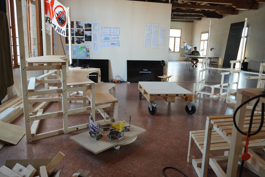 The building process was ongoing and was kept on mutating according to the builders. The process materialized negotiation, weighed dissensus and consensus, and suggested collective discerning of form. Temporary Agora was built of materials collected in Venice by the research group and participants, who where asked to bring material for the Agora.