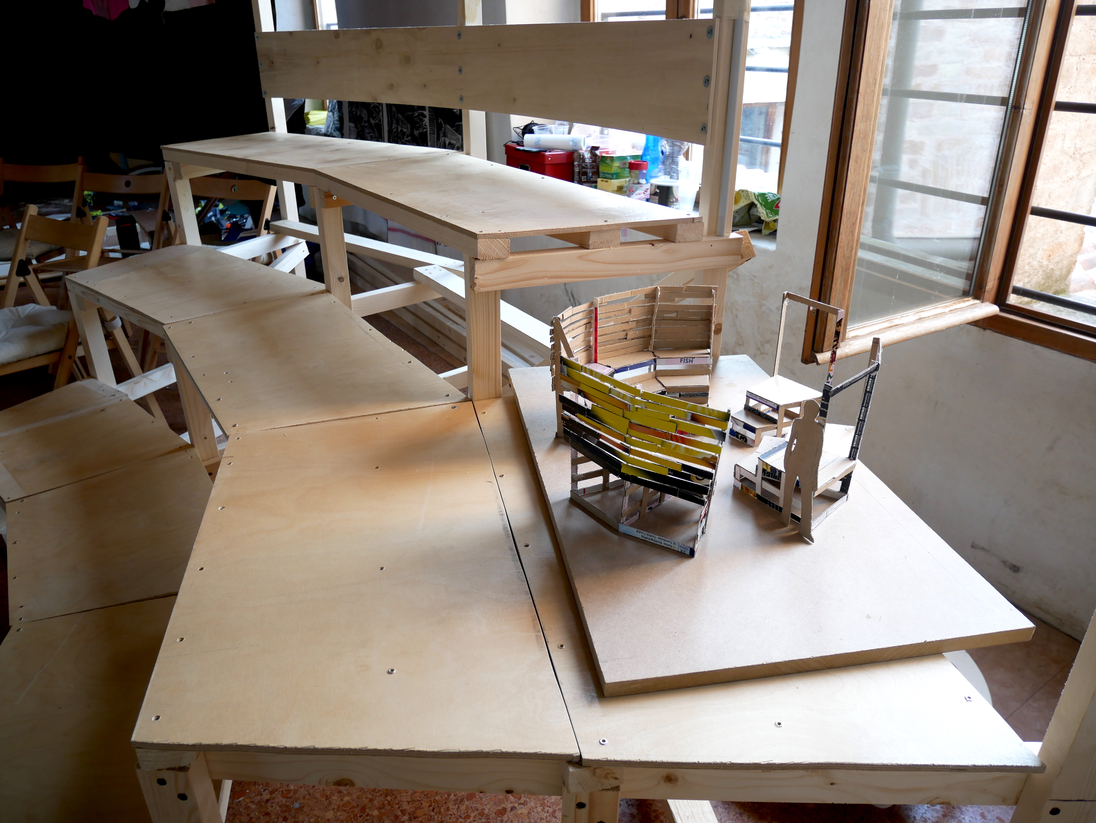 A temporal sculptural construction was built during the two weeks in a workshop open for everybody. The idea was to create a free and open physical and mental space which will serve as the basis for dialogues. The sculptural space included structures for different activities. The round seating area was for meetings, talks, small performances and resting. The sculpture was site-specific and built especially for the pavilion so that it reacts on and alters the room. Temporary Agora worked as a centre of Disrupted processes –group´s activities, artworks and materials.