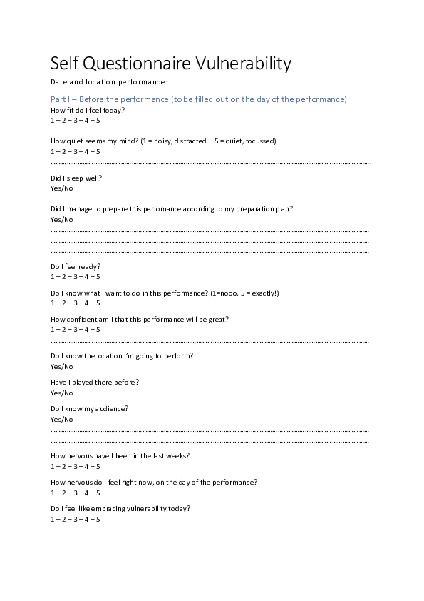 Many musicians think that experiencing and showing vulnerability is a weakness. I see it differently. To share our music with the world, without any assurance of acceptance or appreciation, is to be vulnerable; to be real, to choose courage over comfort, to take off your mask, is vulnerability. The exposure and risk we face, are not optional. In my own musical journey, I discovered that I cannot escape vulnerability on stage. What if embracing our vulnerability is key to convincing, yet authentic performances? This research is not about finding the magic solution for performance anxiety. It is not about avoiding vulnerability, but about embracing it. Embracing vulnerability starts with defining, recognizing and understanding it. That is exactly where this research started: a literature review was done and experts in the field of psychology were interviewed. This led to the design of strategies that can help embracing vulnerability when performing and when preparing a performance. These strategies are used in an intervention over 13 performances that have been documented with audio/video recordings, a journal and a self-questionnaire. Results show that performance preparation is a crucial element in dealing with vulnerability. Also, embracing vulnerability led to more experiences of ‘flow’, enhanced focus and increased trust in my abilities to perform music. Besides, I felt more authentic as a performer. These findings, although subjective, provide insights and strategies that could be of great benefit to other musicians.