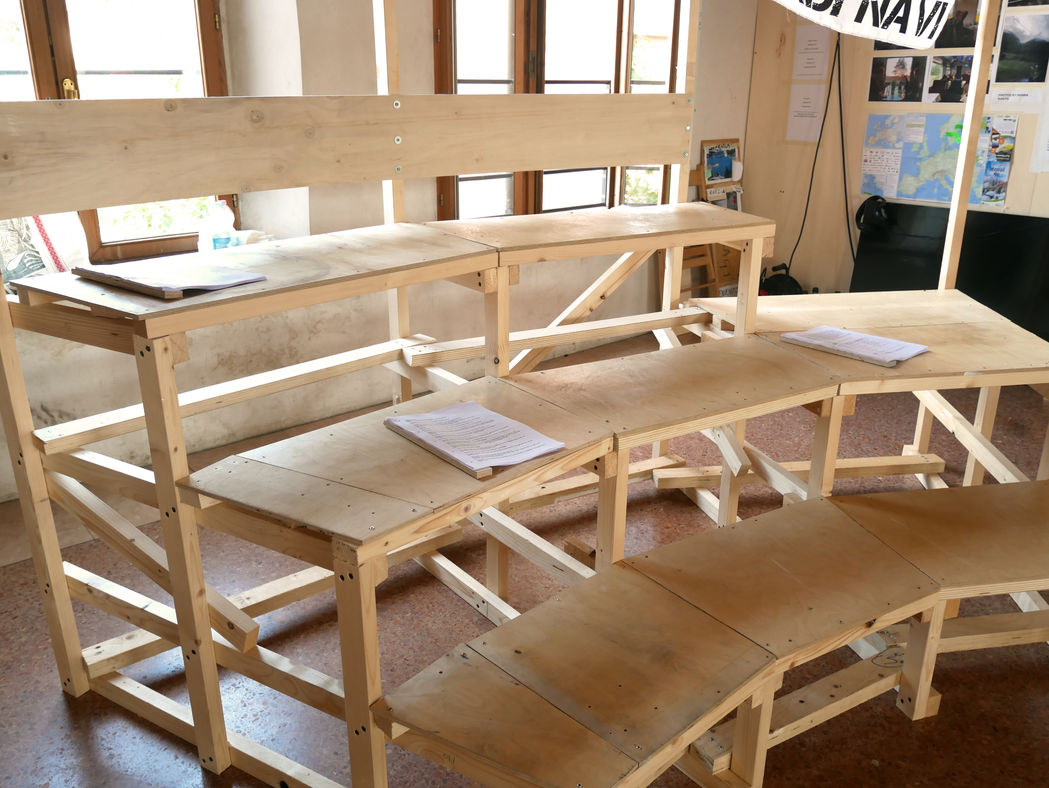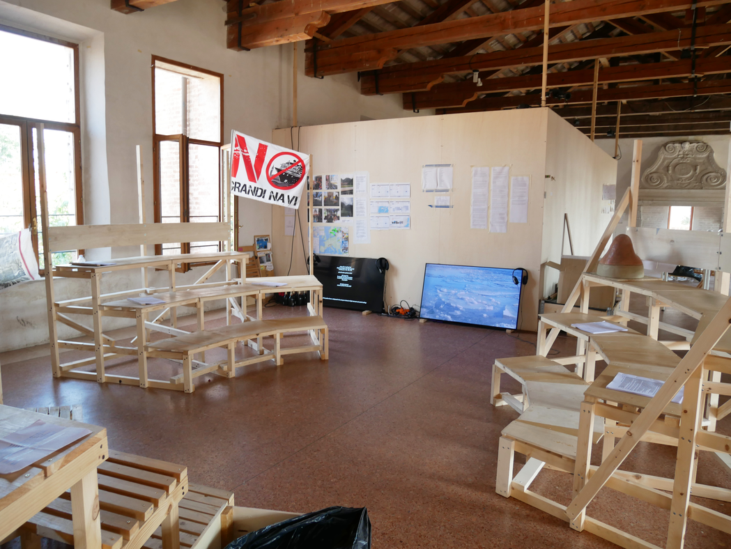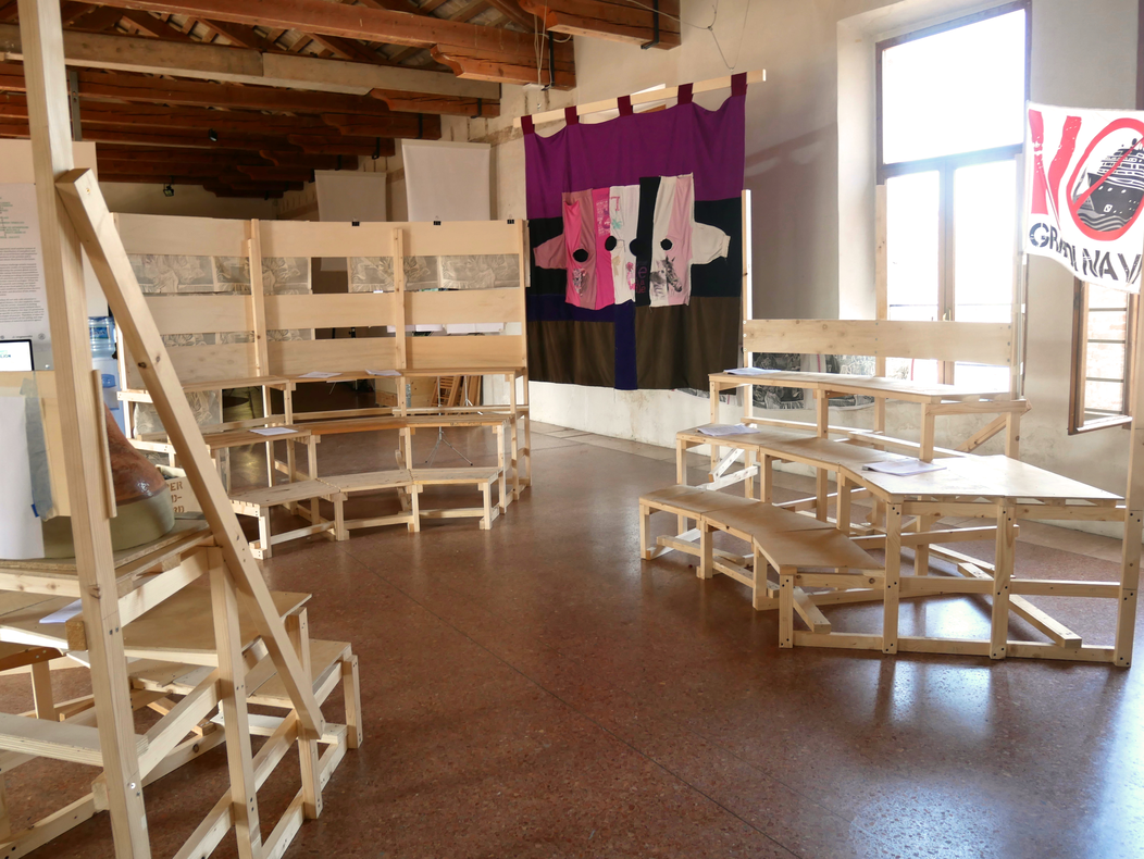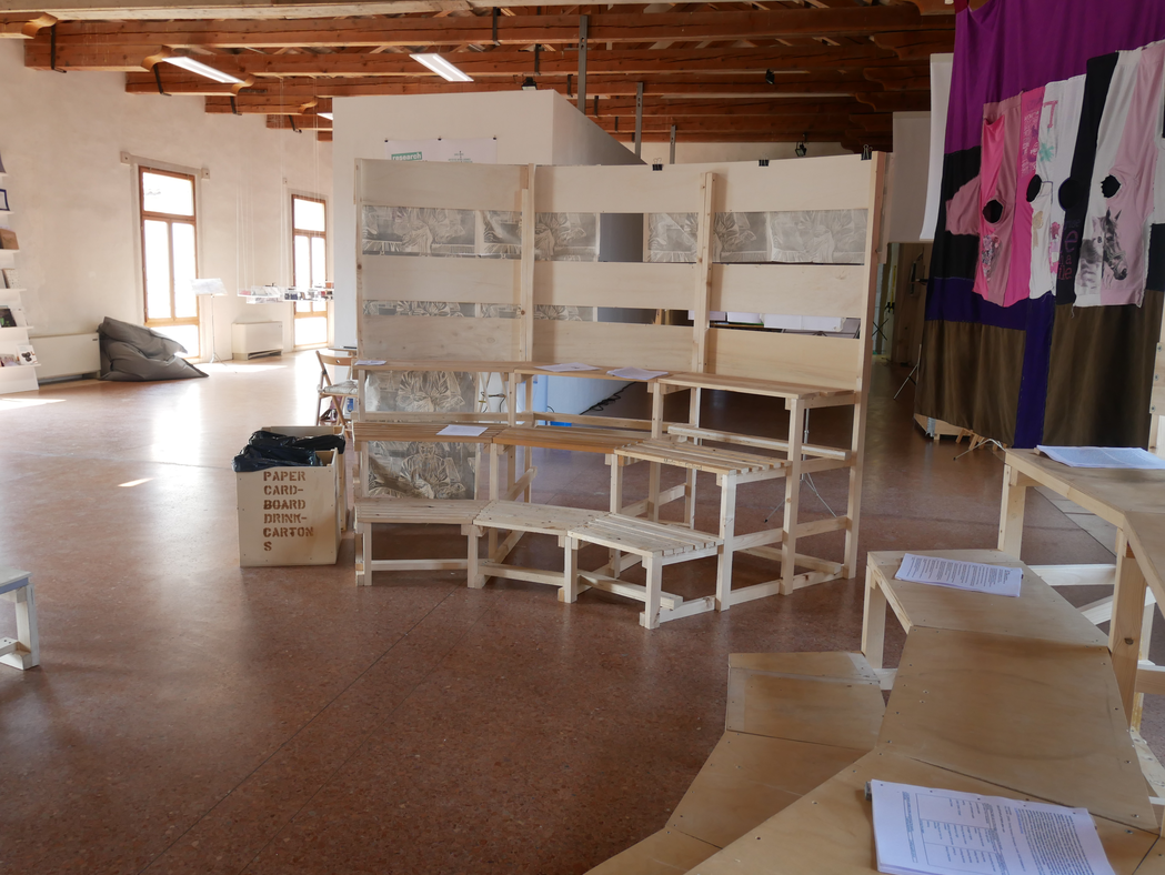 The Temporary Agora, a collaborative sculpture facilitated by Anni Laakso, was an outcome of one of the Disruptive Processes workshops at the Research Pavilion #3 in Venice 2019. On the structure texts from the workshop Wording - Collaborative Writing in Public Space facilitated by Lena Séraphin. In the background to the left the videowork Disrupt by akcg and to the right The Reading Circle by Jaana Kokko. Banner by Jaana Kokko. Photos by Anni Laakso.