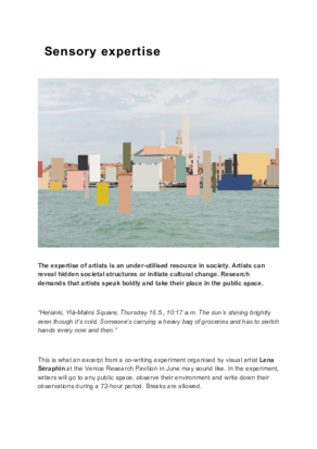 Sensory Expertise article by Mervi Itkonen/Kaskas Media, published 29/5/2019 on Uniarts website. Click icon to the right or link https://www.researchpavilion.fi/news//asset_publisher/IdwokuiuAebS/content/sensoryexpertise_101_INSTANCE_IdwokuiuAebS_redirect=%2Fnews