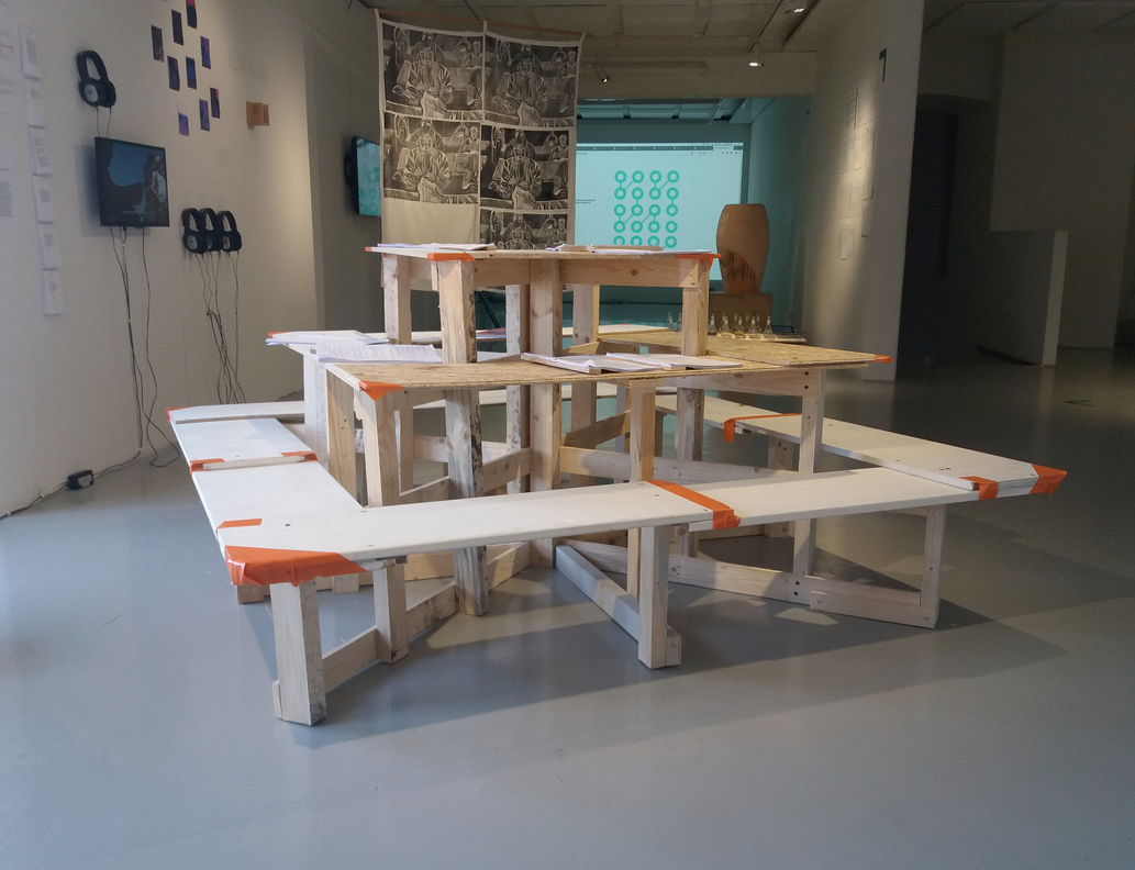 The Temporary Agora facilitated by Anni Laakso, in the background printed work by Jaana Kokko, Wording works by Bartaku, Andrea Coyotzi Borja and Suvi Nurmi.On the structure the texts from the workshop Wording - Collaborative Writing in Public Space, 2019. The installment of the Temporary Agora at the Info Lab was a continuation of the temporal sculptural construction facilitated by Anni Laakso at the Research Pavilion in Venice.