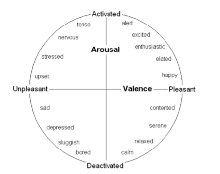 This valence and arousal model could be transcribed into general emotional terms by using The Circumplex Model of Affect by Russell (1980):