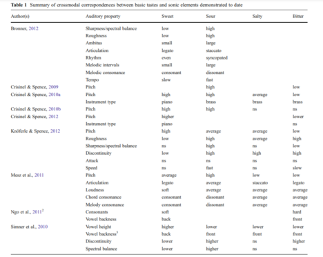 The review has aggregated significant results of researches on crossmodal correspondences between sounds and tastes. The table from this review is presented below.