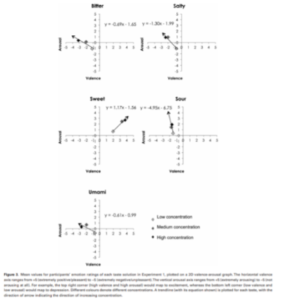 - Salty in a low concentration resulted from valence/arousal (-0.5,-1) and in a high concentration (-2.5,+1), indicating tendencies toward stress emotion.