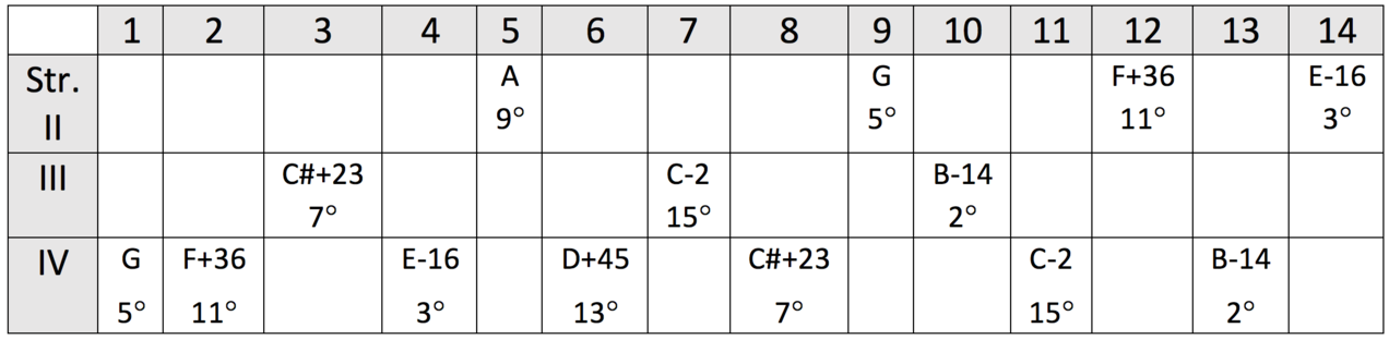 Fig. 4: The structure of The endless mobility of listening as a series of cycles of re-tunings of the violin strings II–IV. Each column shows the new pitch of that string, and which partial is B(-14¢).