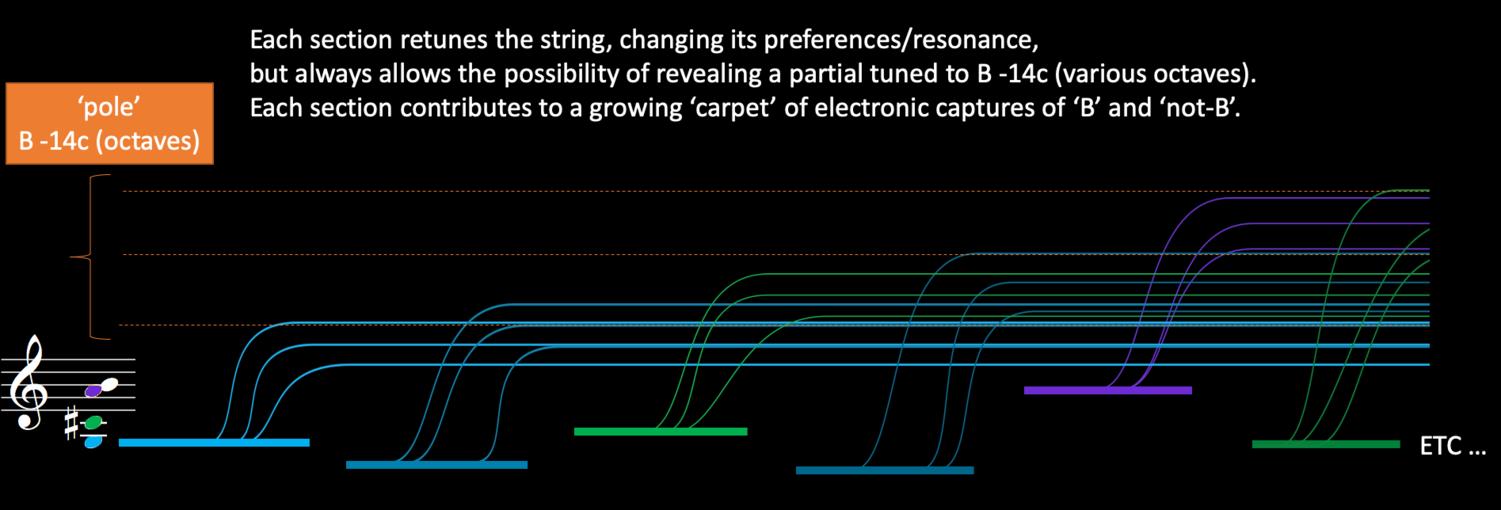 Each cycle takes a different open-string scordatura (see Fig. 4), in which the string is retuned at the start of each cycle; the retuning slackens the string and resets its hierarchy of preferred harmonic partials. Fig. 4 shows how the tuning schema of each string relates to a common anchor pitch: B5 (-14¢). Initially, this is the fifth partial of G, with each subsequent retuning chosen so that B5 or B6 is present as a low-order partial. In each section, this B will be potentially present, but whether it emerges as an available partial is contingent on various material or environmental factors. At this point, it is useful to understand the anchor pitch as an entwined agential nexus that focuses the dance of human and material agencies. The anchor pitch both directs human agency (as a beacon rather than a required sonic element) and acts as a variable potentiality of each string configuration.