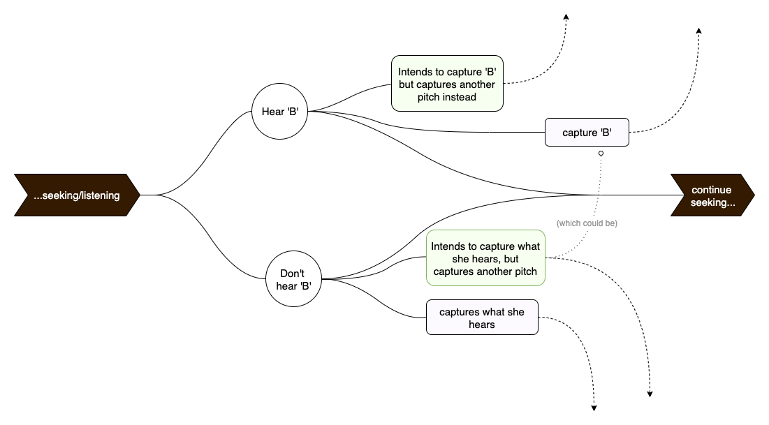 Fig. 9: Flowchart of decisions Benjamin can take during her listening process as responses to the material agency of the string. The exit lines indicate partials captured by the electronics.