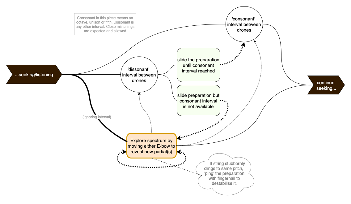 Many conversations between Benjamin and McLaughlin during the research and creation phases of their collaboration centred around the relationship between Benjamin’s exercising of her own enactive bodily agency (technique) over the instrument, and the violin as itself a resonant body with its own material agency. As the violin’s material behaviour shifts from cycle to cycle of the piece, this changing environment is in flux with Benjamin’s responsive process of listening and bowing as situated by the rules of the score: a higher-level conscious decision matrix that inflects her playing. The following flowchart attempts to summarise this decision matrix.