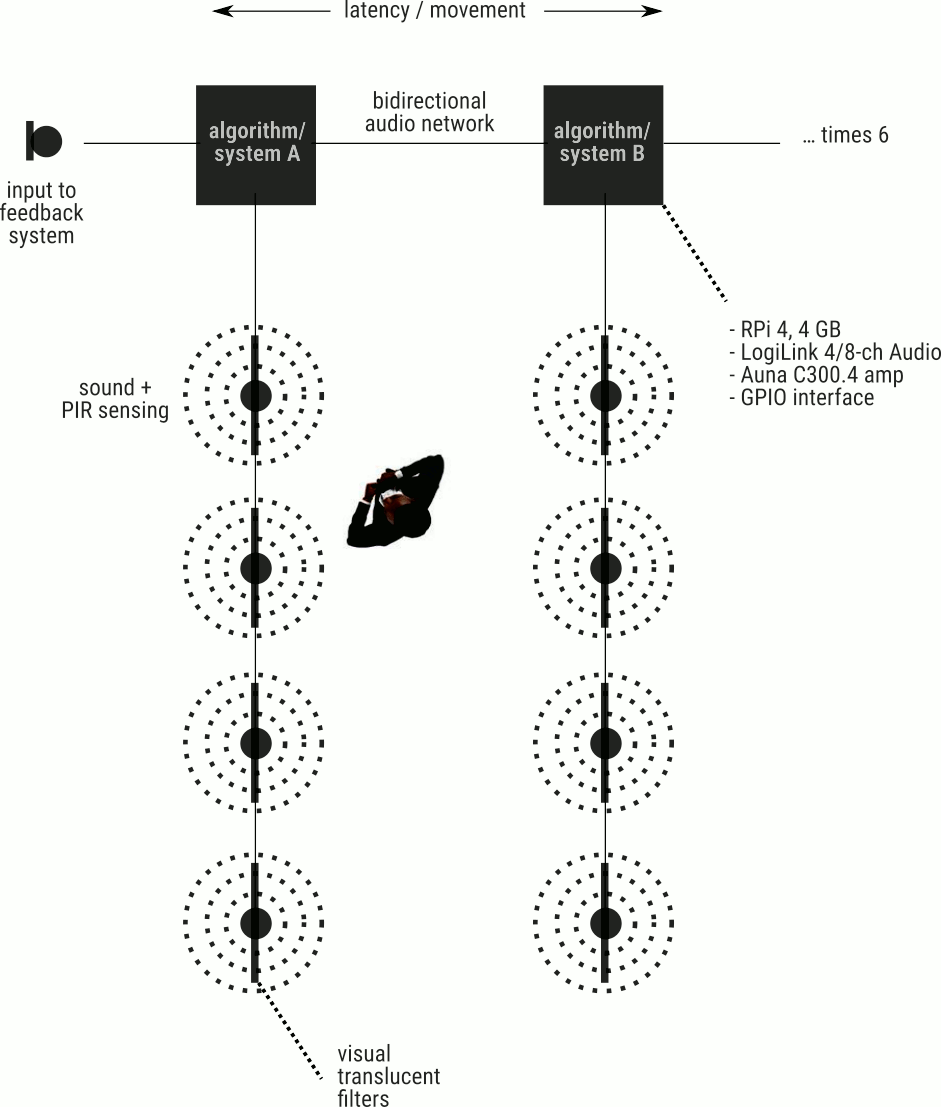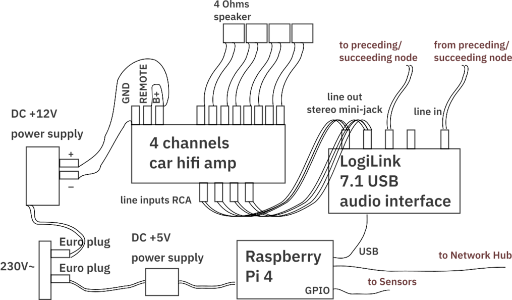- Each row is implemented as a self-contained machine (Raspberry Pi 4, 4 GB, LogiTech 8-channel USB sound card, 4 channel amplifier, 4 speakers, Dynavox PS 138)
