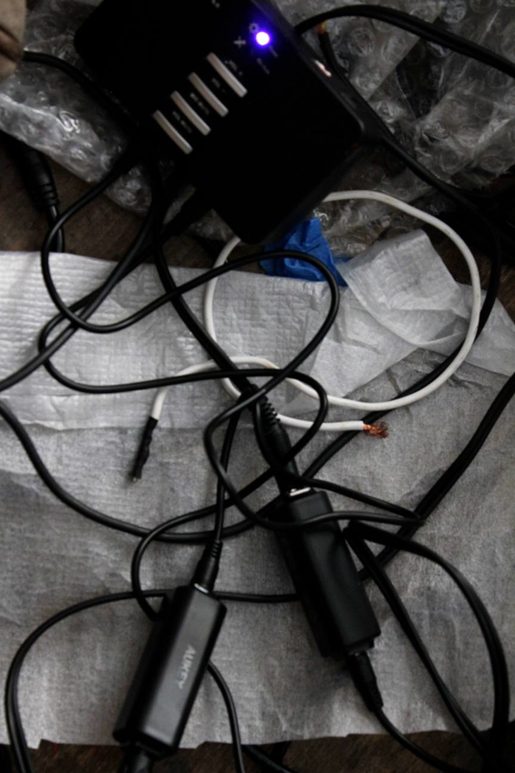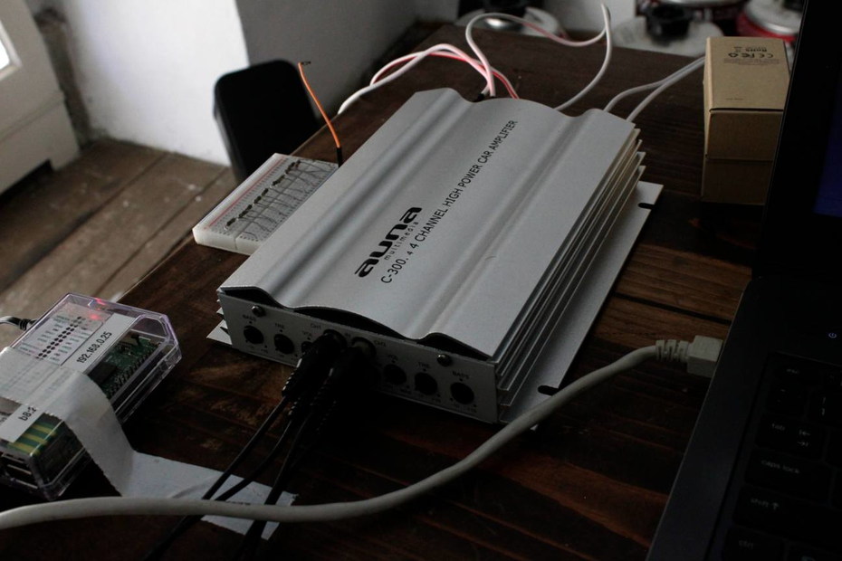 four-channels amplifier (and Raspberry Pi on the left). The idea is to create "self-contained" rows in the space, each consisting of one Pi, one audio interface, one amplifier, one set of speakers, one set of sensors.