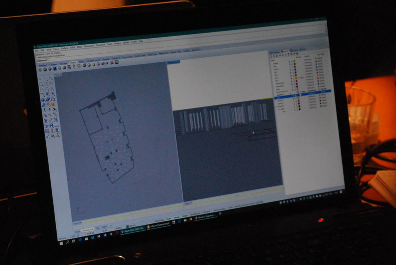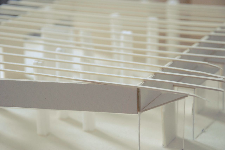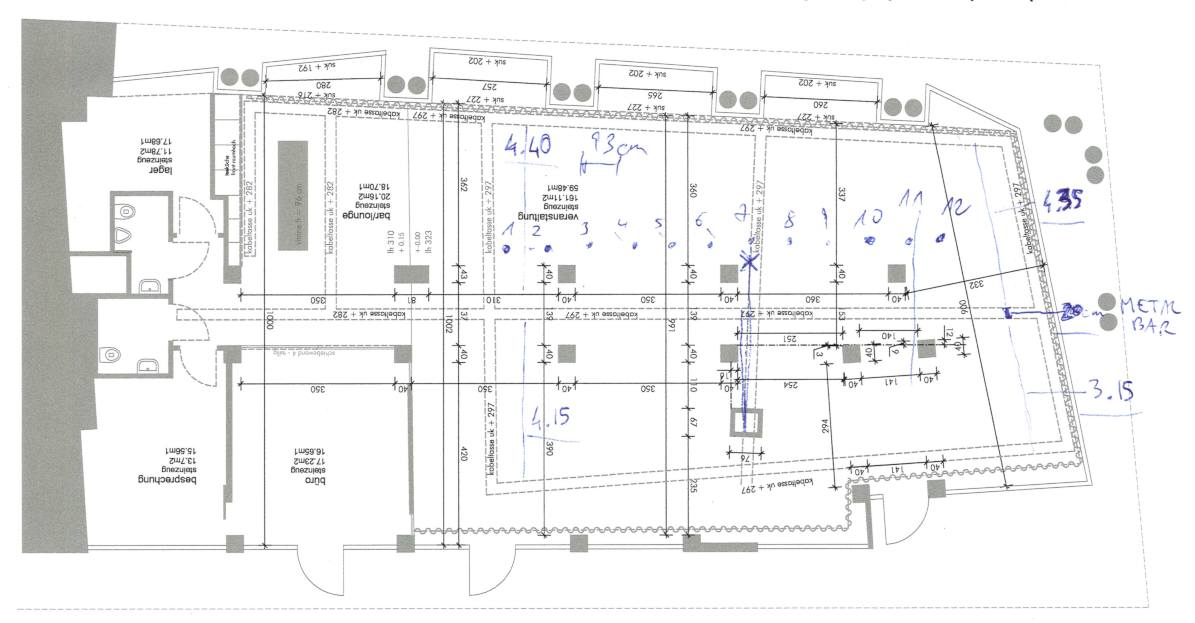 We settled on the twelve rows, and iteratively found that a spacing of 93 cm between rows would work out with both the positions of the columns and desired spacing for visitors to walk through.
