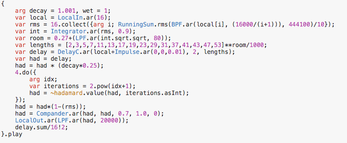 The two questions by Hanns Holger and David somehow resonated (ahah :/ ) together and stimulated the quick experiment that you can listen here. Especially what David noted, that the acoustic properties of a space are inscribed (more or less indefinitely, I would say) in the space itself, made me want to try to simulate a room that escapes this rule. It's essentially a room whose dimensions slowly shrink or expand according to the different resonances that are excited over time. I basically divided the spectrum in 16 zones, and the energy of each zone affects the lenght of one of the 16 delay lines (== changes the room dimension).