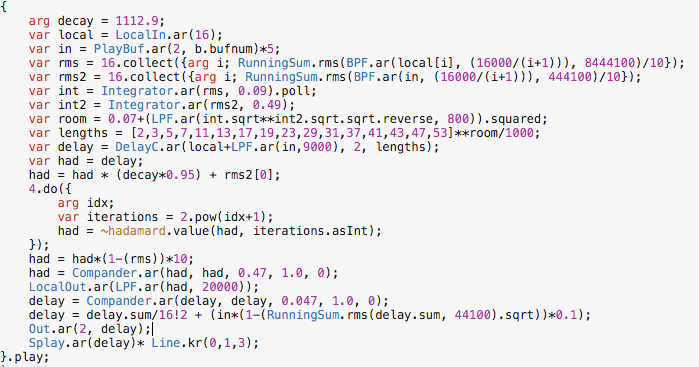 It's interesting how you relate the question of edges with the idea of expanding the space, that I also find quite intriguing. You suggest that such an expansion could be achieved by "not having any processes that could make the perception of the whole sound not be associated with the sounds of surrounding" and two practical steps in this direction could be amplification and slight distortion. I thought of trying it out, so I started playing a bit with the audio files David recorded in the staircase and the sc patch I wrote last time. What I aimed at first was sketching out a process using amplification and slight (temporal) distortion - reverberation - to play a bit with the idea of plausibility. having a ground situation of amplification, then moments of "expansion" - kind of expanding acoustic sounds into plausible articulations - and then falling back into amplification again (I think the result it's still a bit too